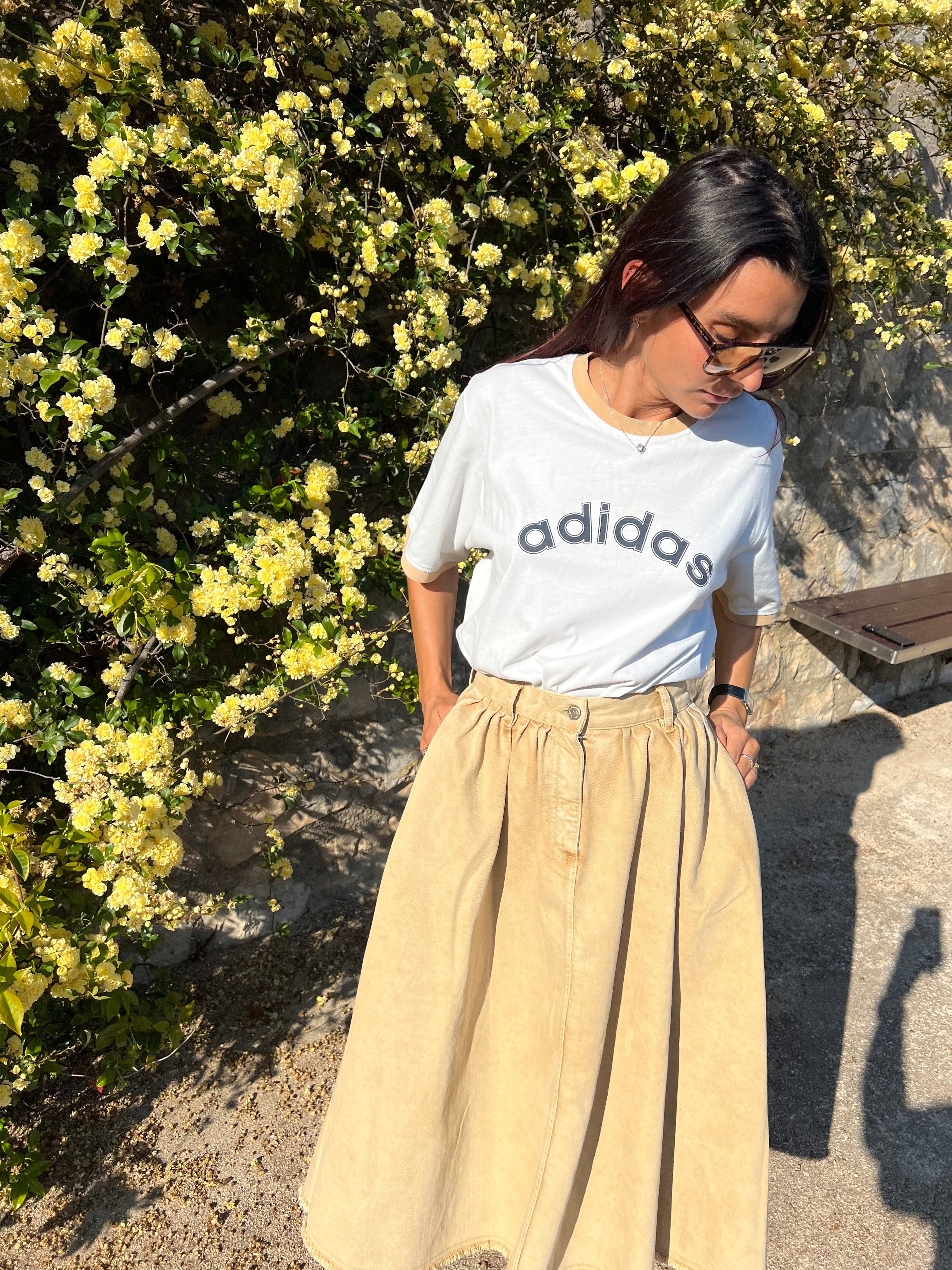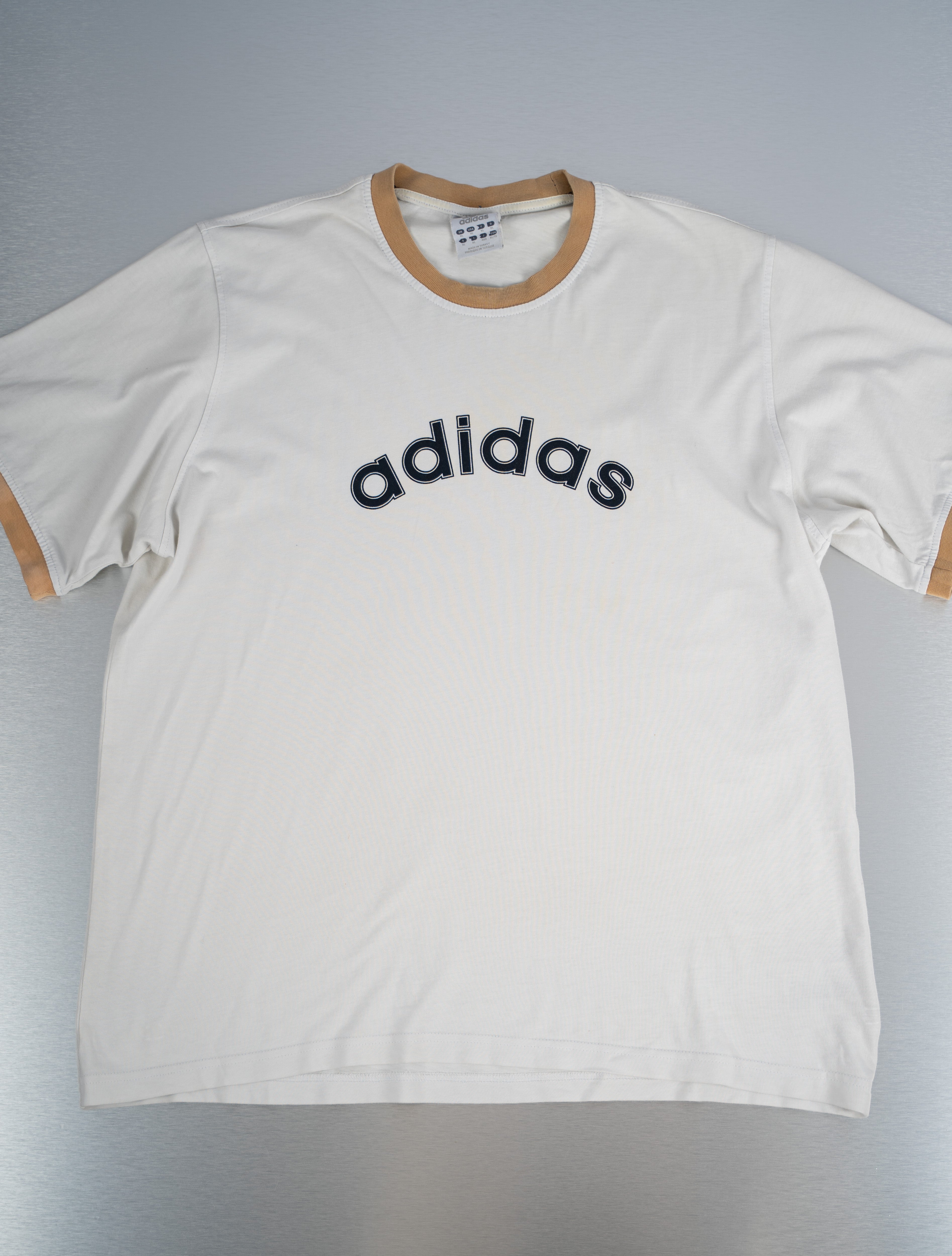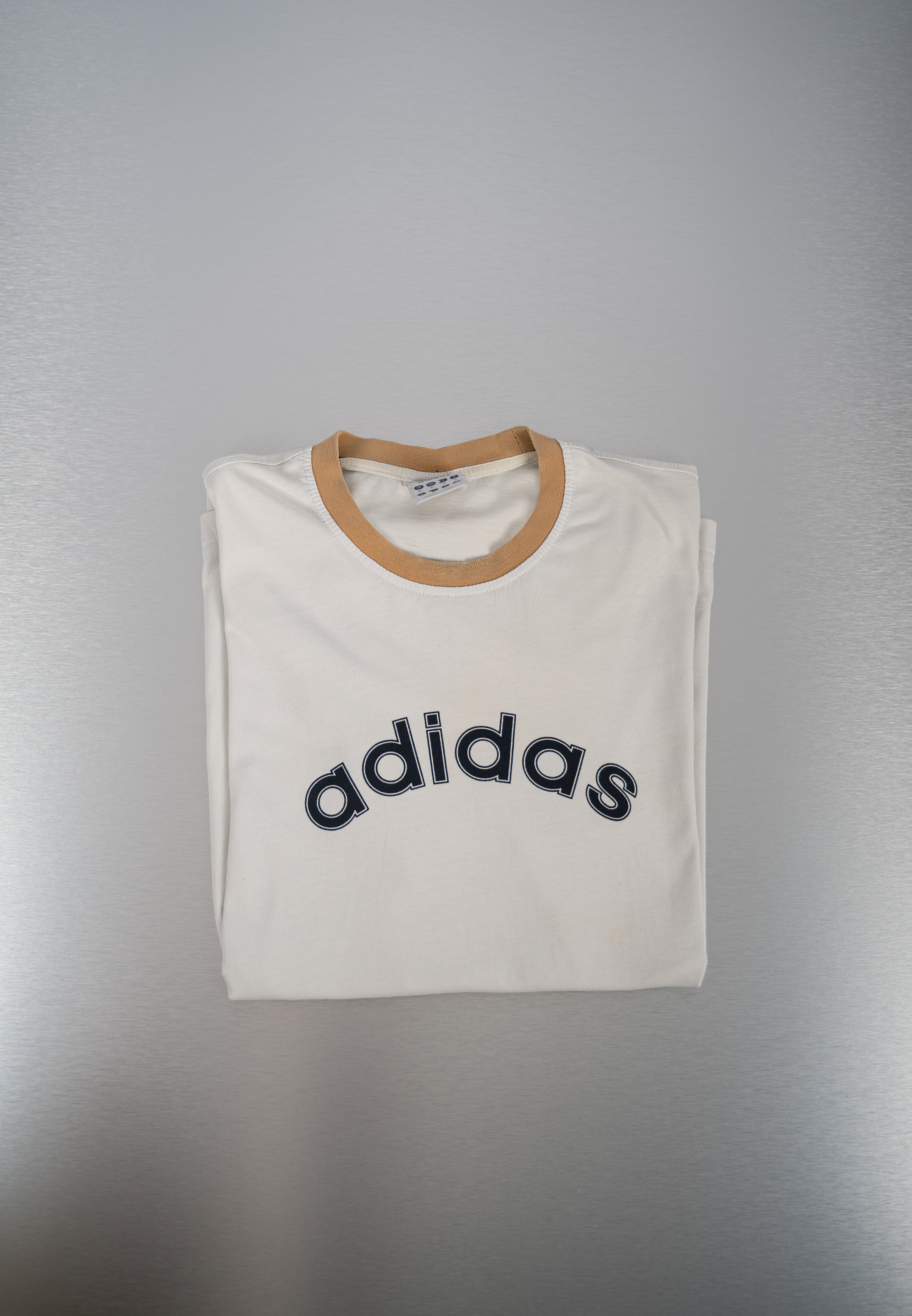 This Adidas White Short-Sleeved T-Shirt is a classic piece. Crafted from cotton, this short-sleeved T-shirt features a white color with a tan-colored collar and underarms. The shirt displays the word "adidas" in black letters across the chest. It has a classic crew neck design. This comfortable t-shirt is in Good condition.