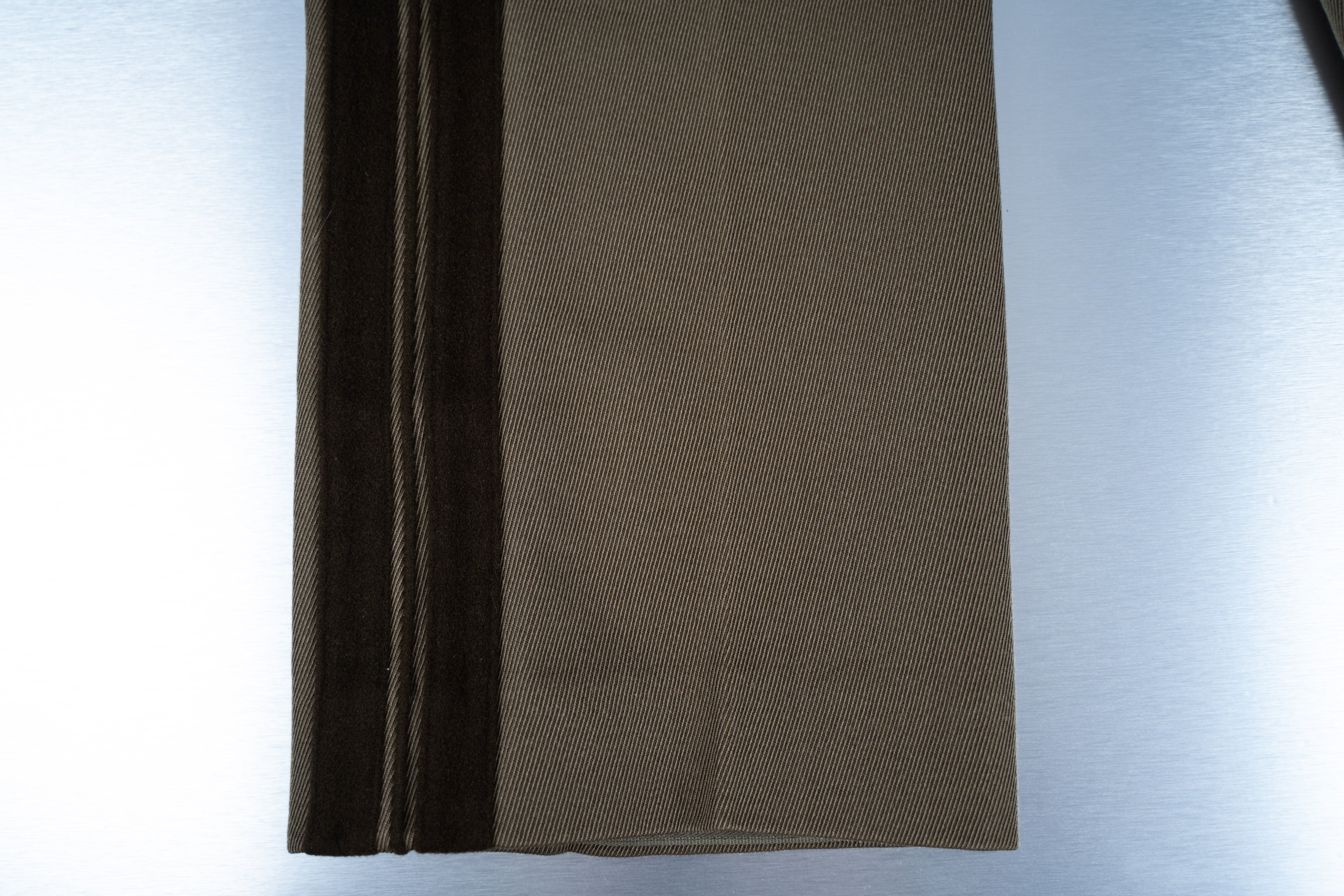 These Army Vintage Suit Pants are a unique and stylish choice. Crafted from khaki-colored cotton twill fabric, these men's dress pants feature two dark brown stripes running down the outside of each leg. They have a classic straight-leg cut, flat front, belt loops, and two back pockets. This product is in Good condition.