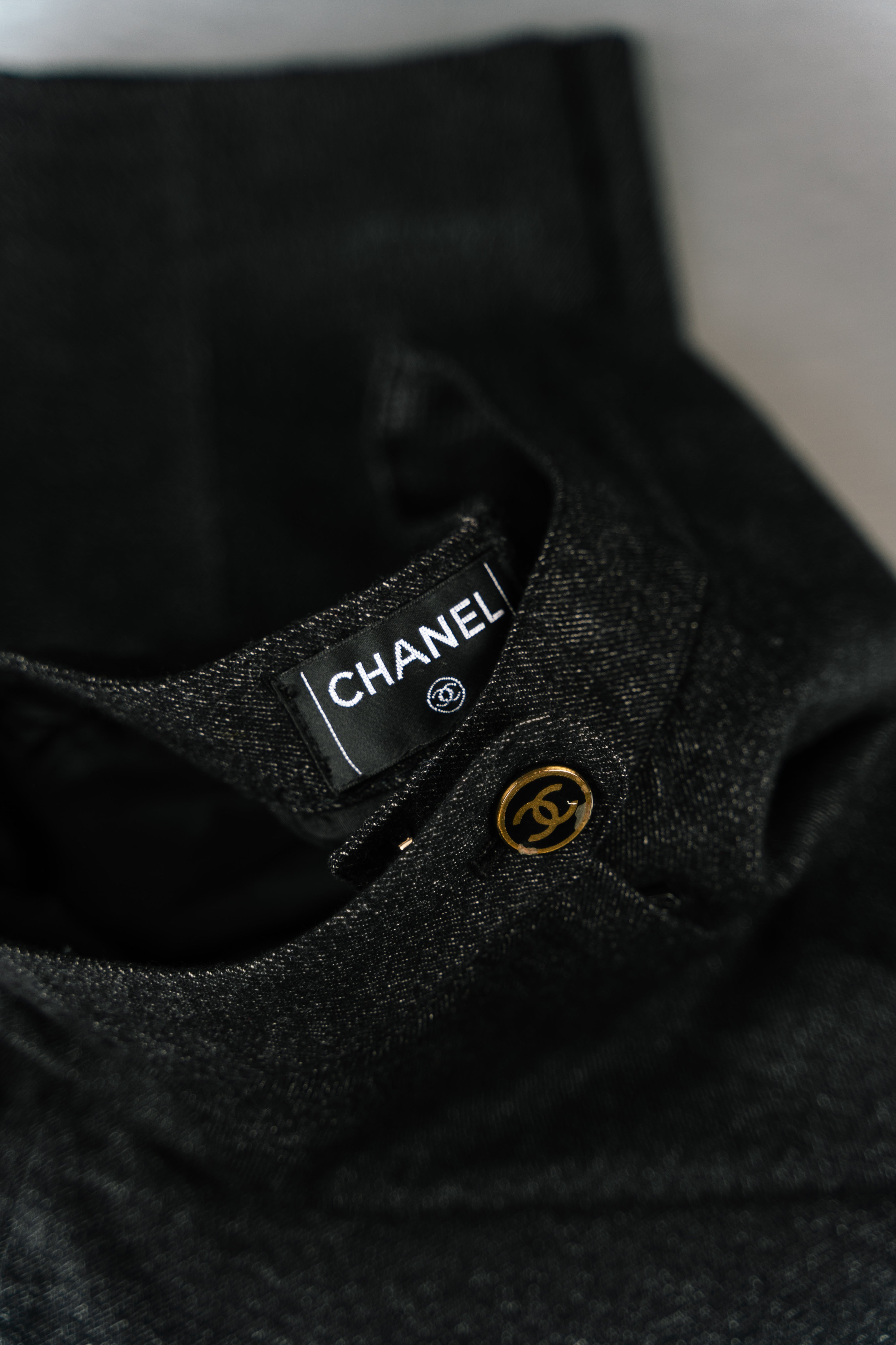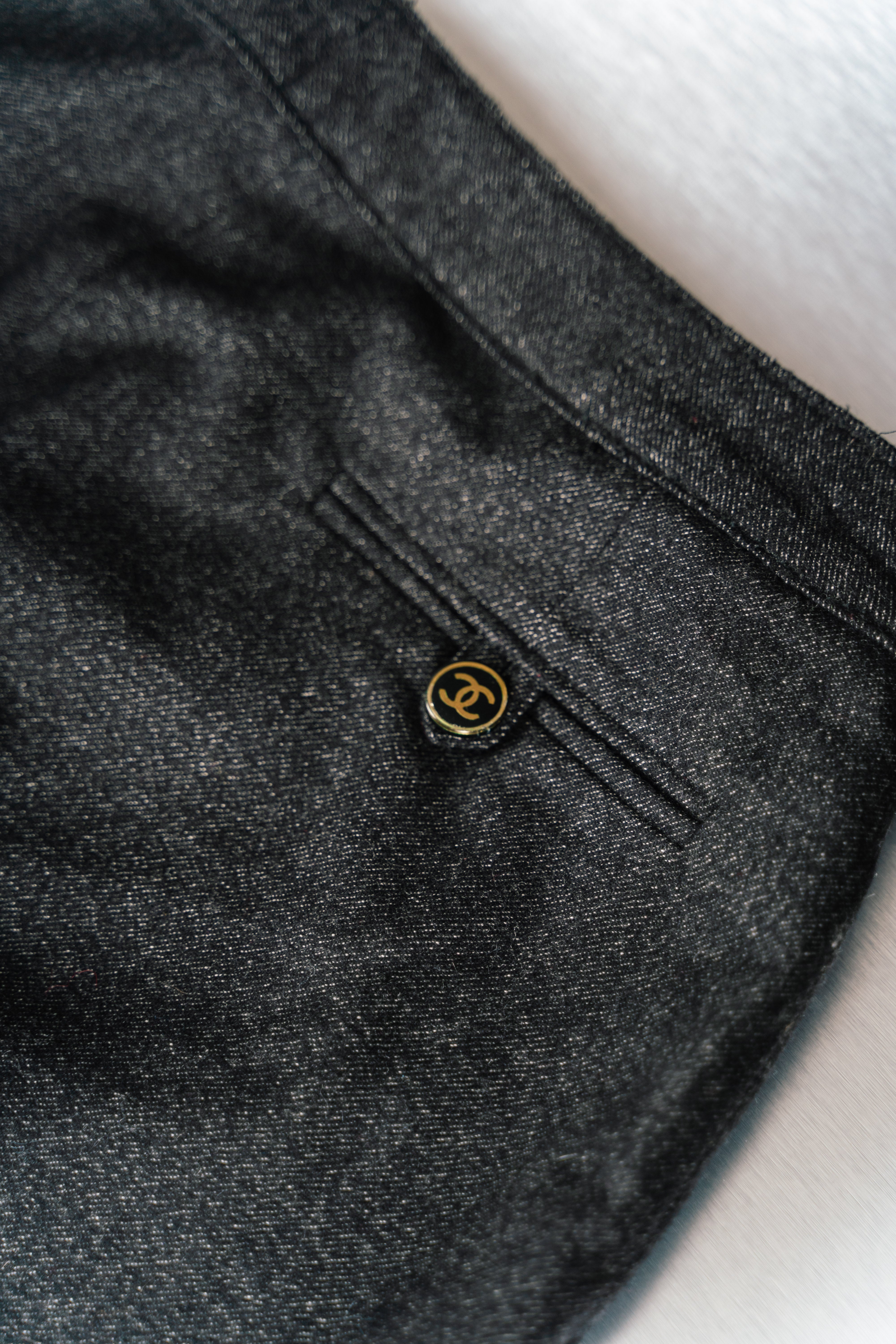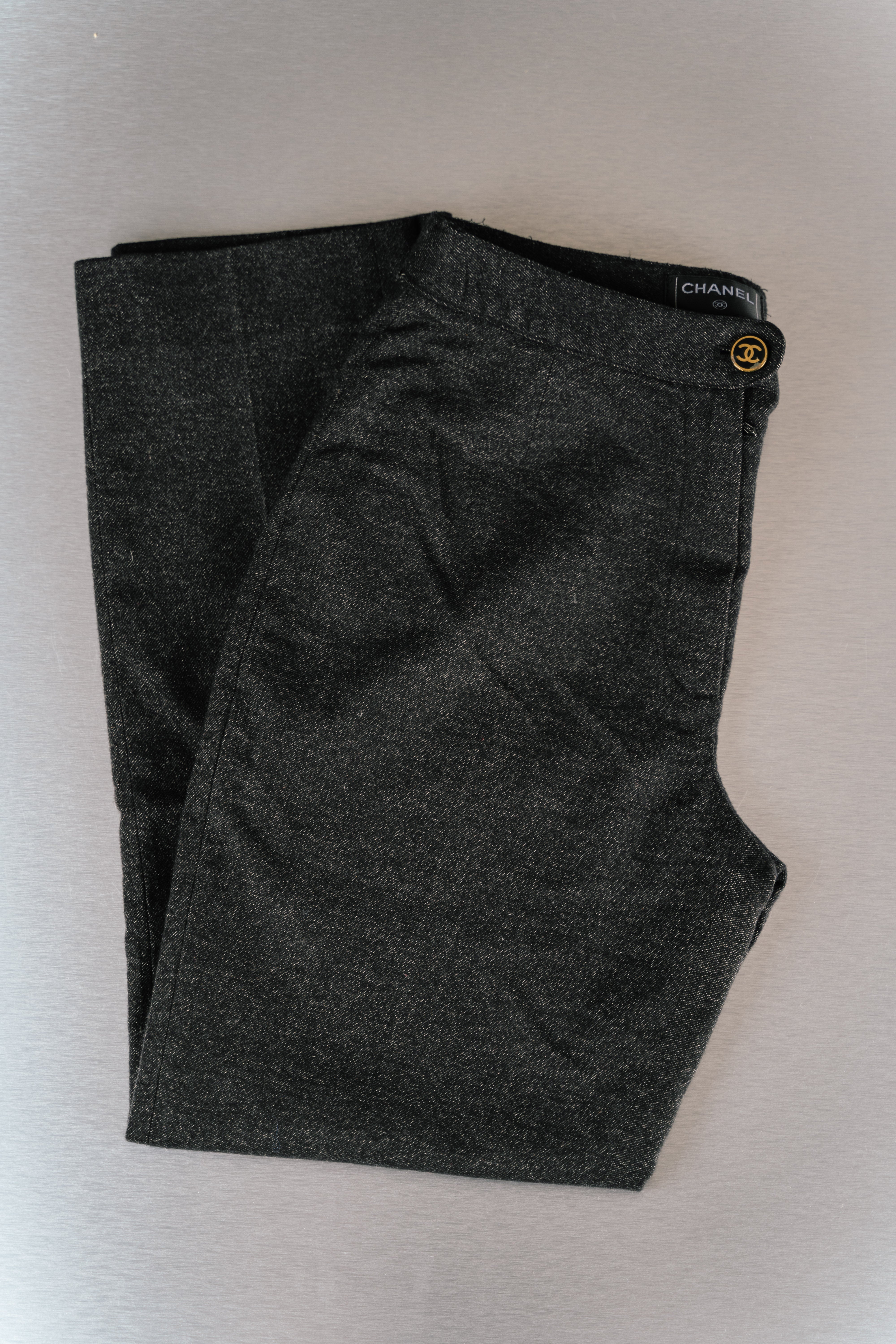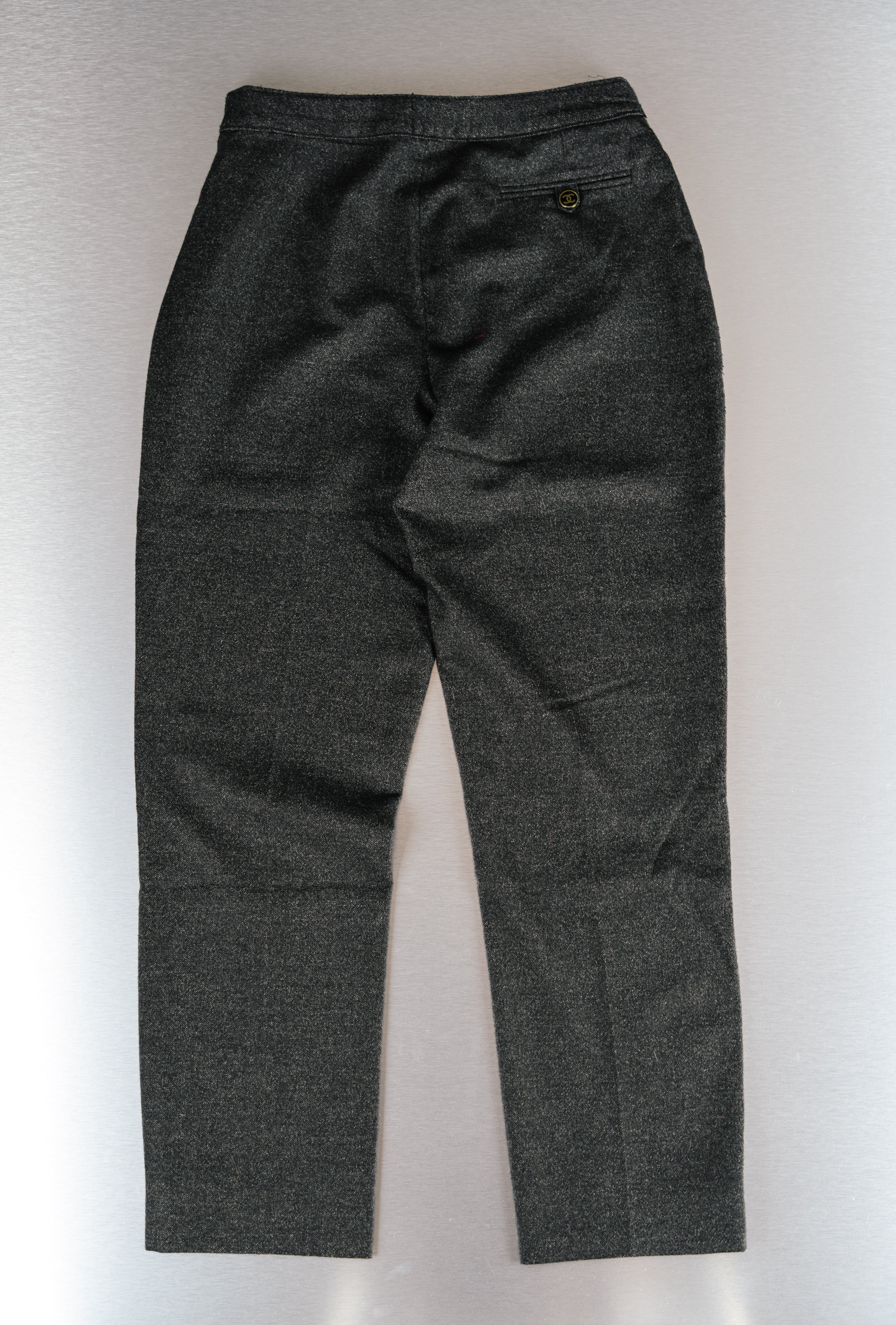 Chanel Chino Pants Dark Grey. These sleek, black leggings from Chanel are crafted from a comfortable and flexible polyester-spandex blend. They feature a high waistband with a distinctive Chanel logo tag. Perfect for a stylish and comfortable look. This product is in Good condition.