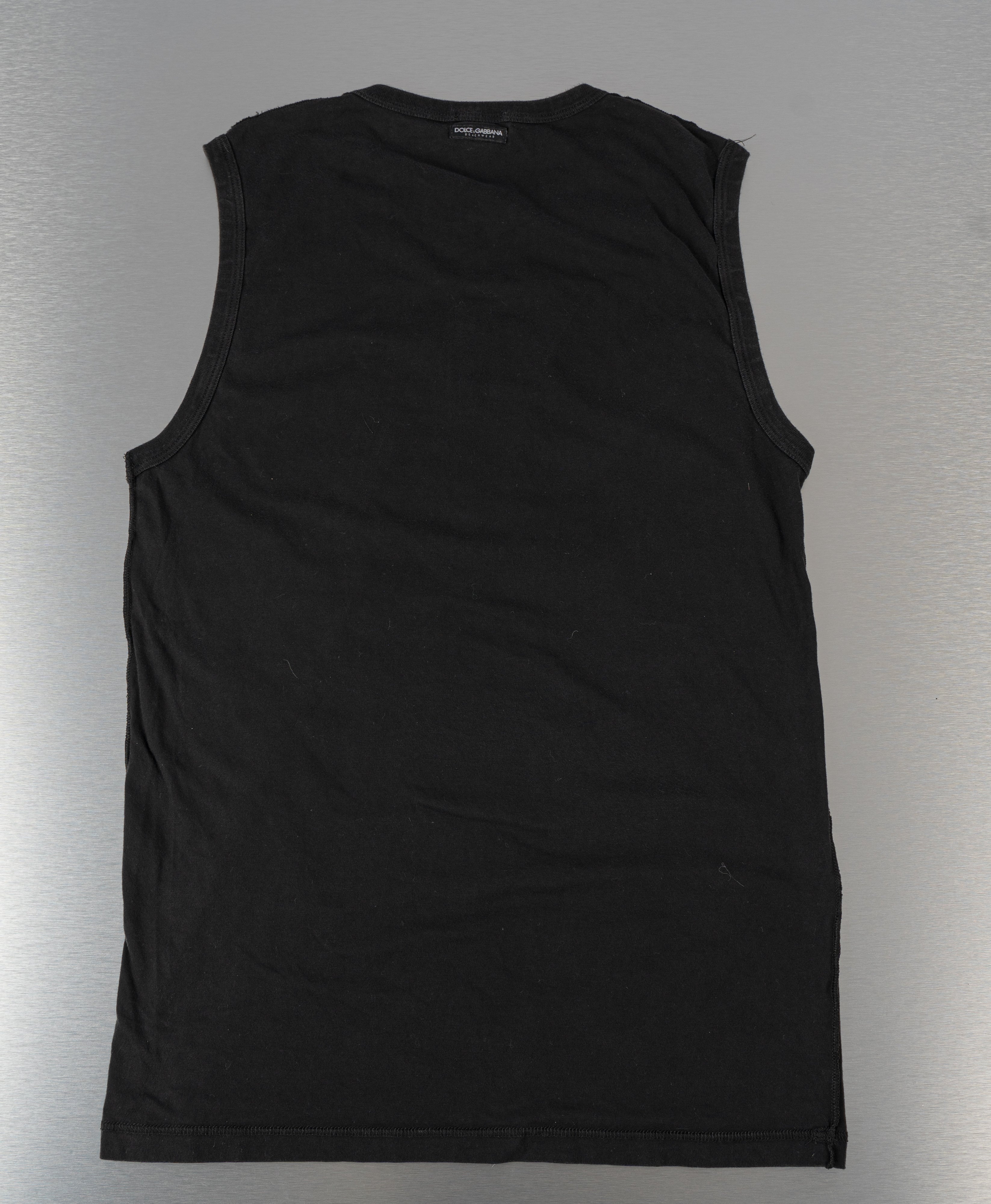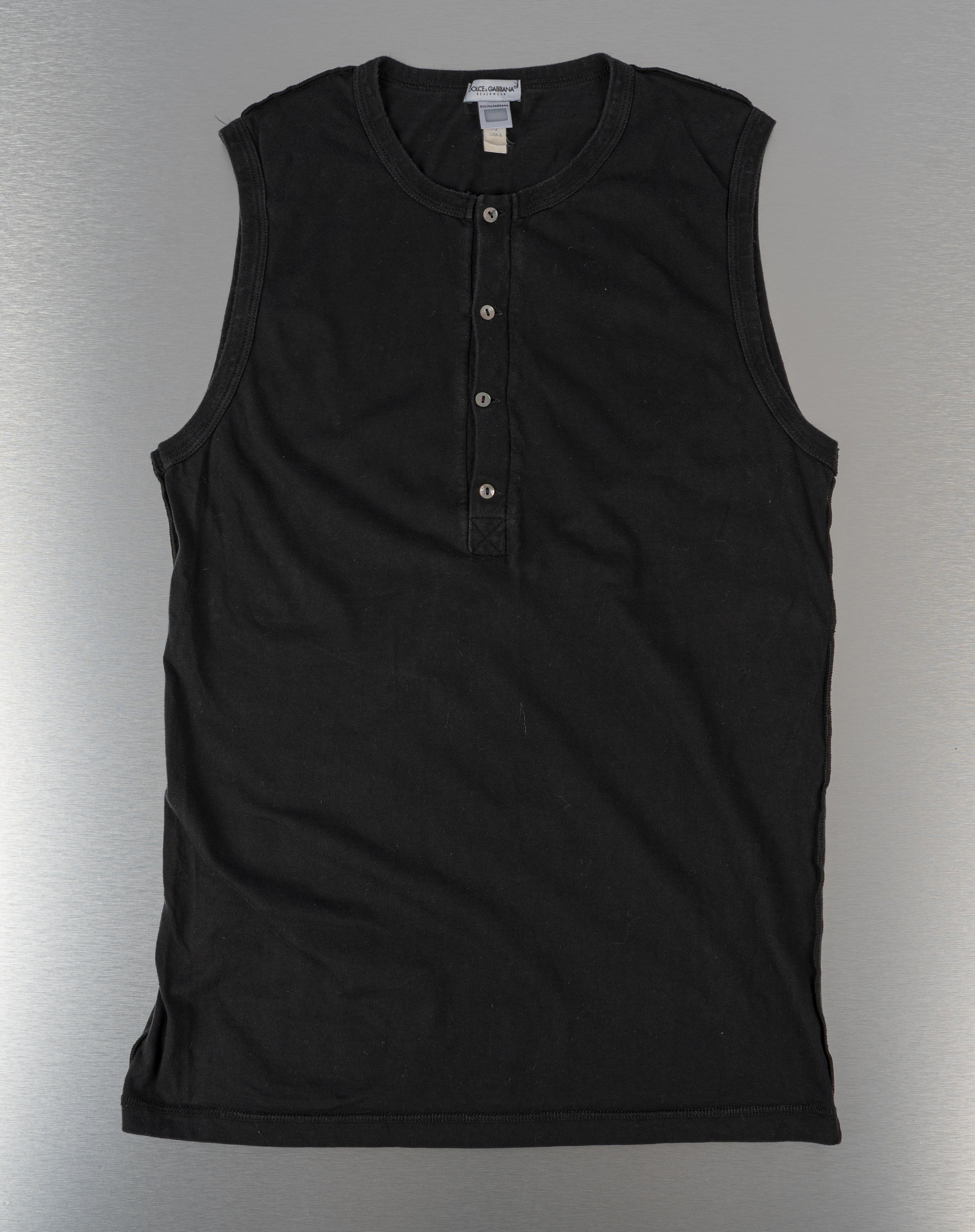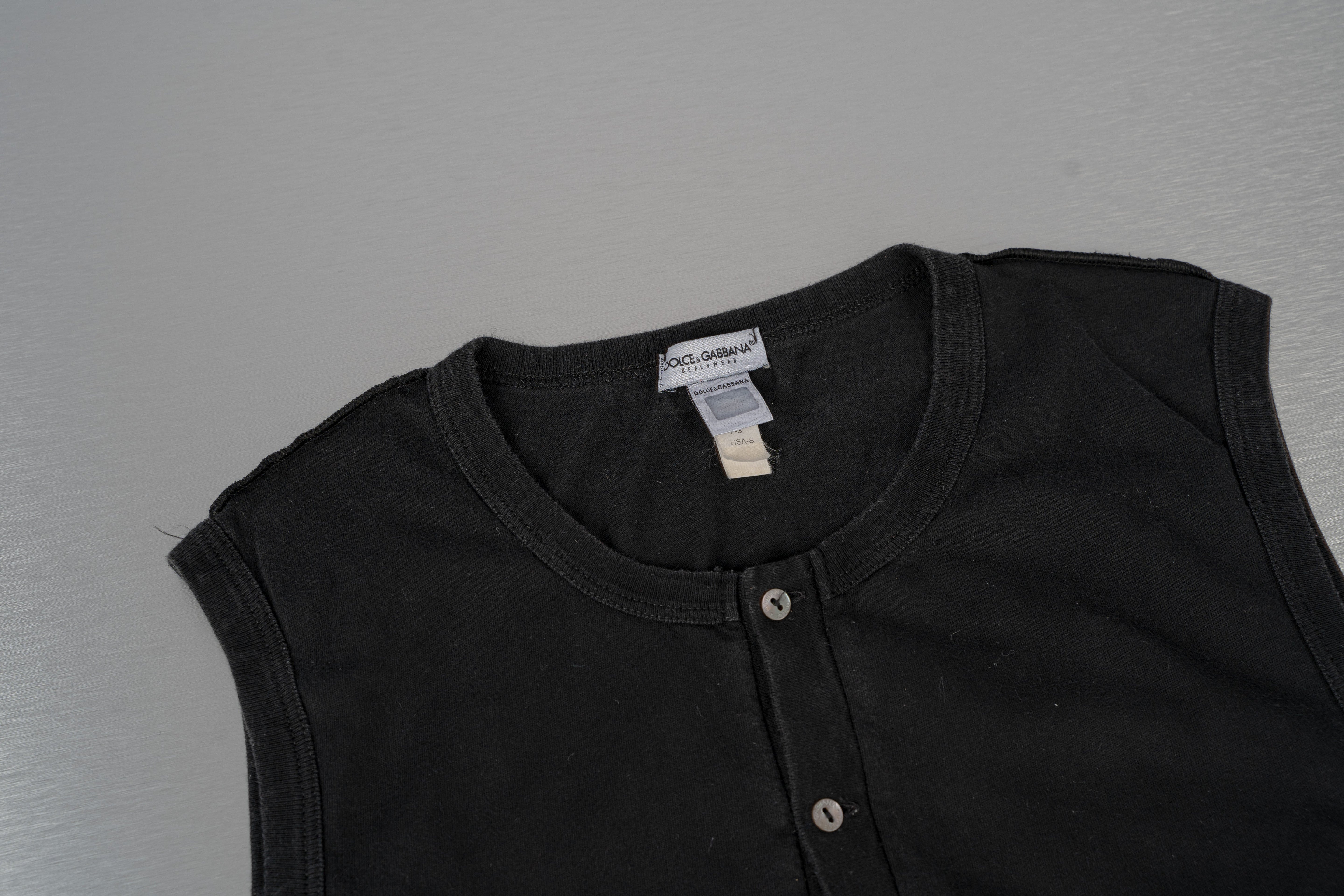 This Black Sleeveless Button-Down Shirt is a classic and versatile piece. Crafted from cotton, this sleeveless shirt features a round neckline and four gray buttons down the center. It is a solid black color with no visible patterns. This shirt is designed for men and is in Good condition.