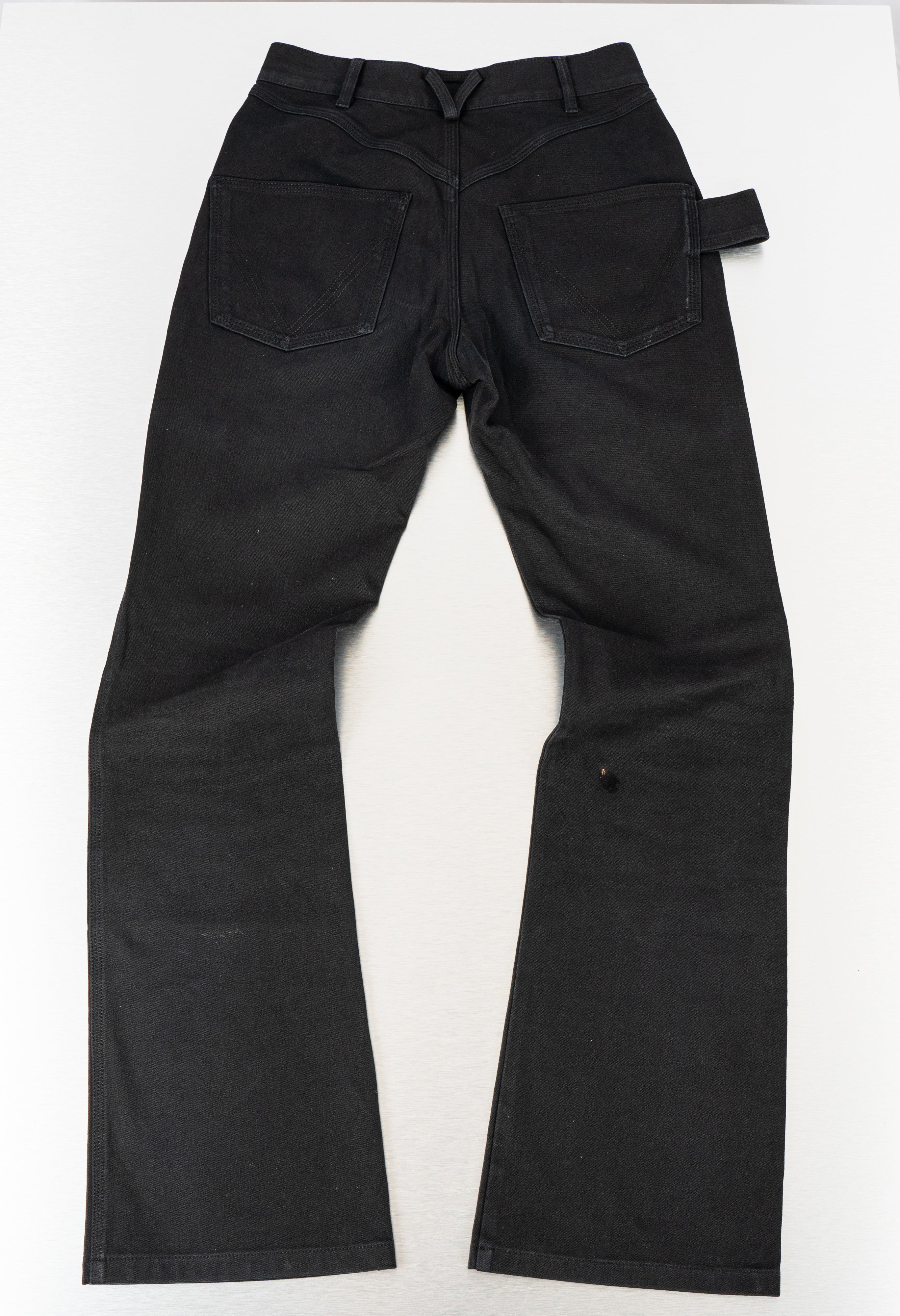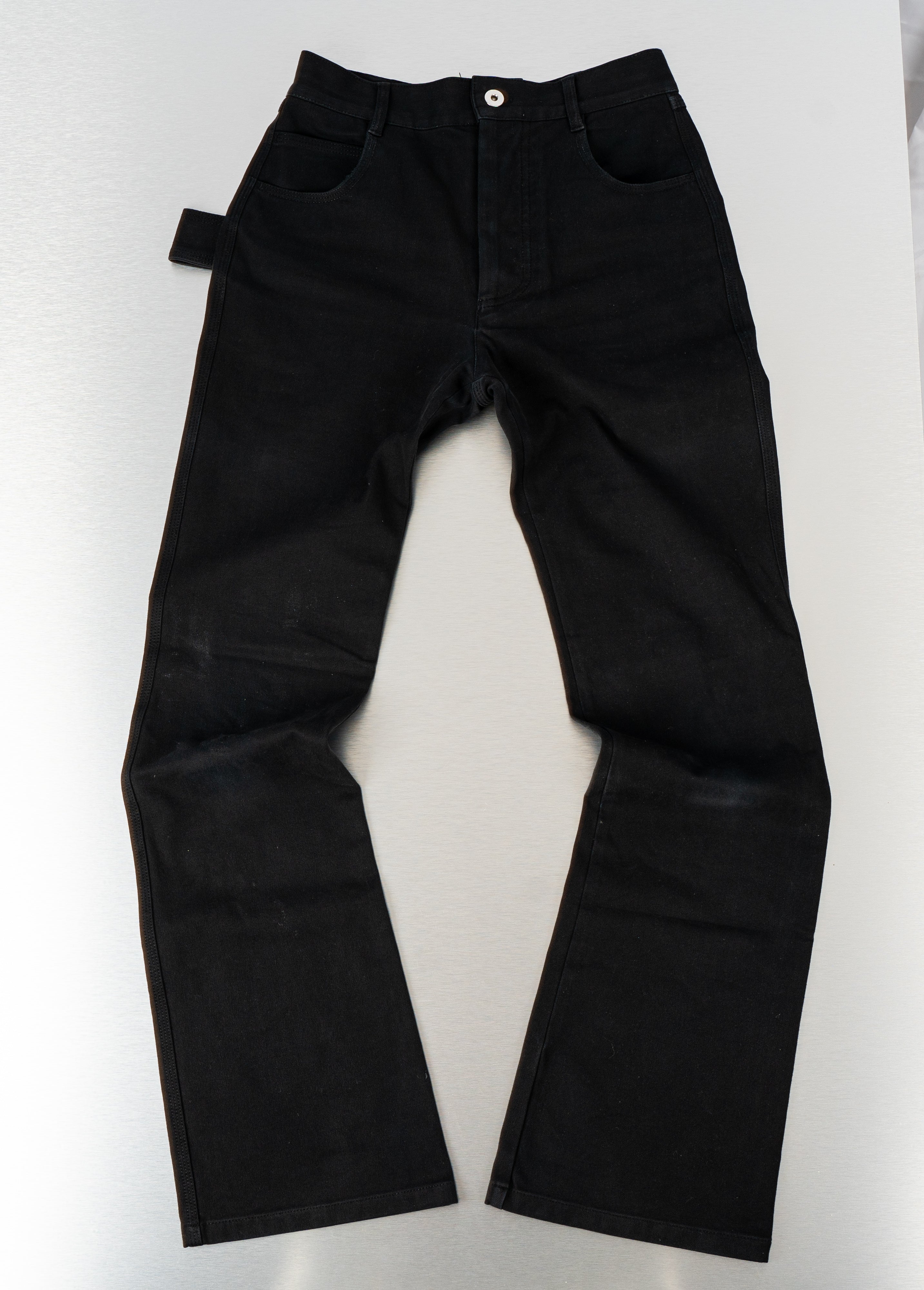 These Bottega Veneta Black Jeans are a stylish and versatile choice. Crafted from a durable cotton-blend fabric, these black jeans feature a skinny flare fit and a unique green Bottega button detail. They have a classic five-pocket design, with two back pockets and three front pockets. These versatile jeans are in Good condition.