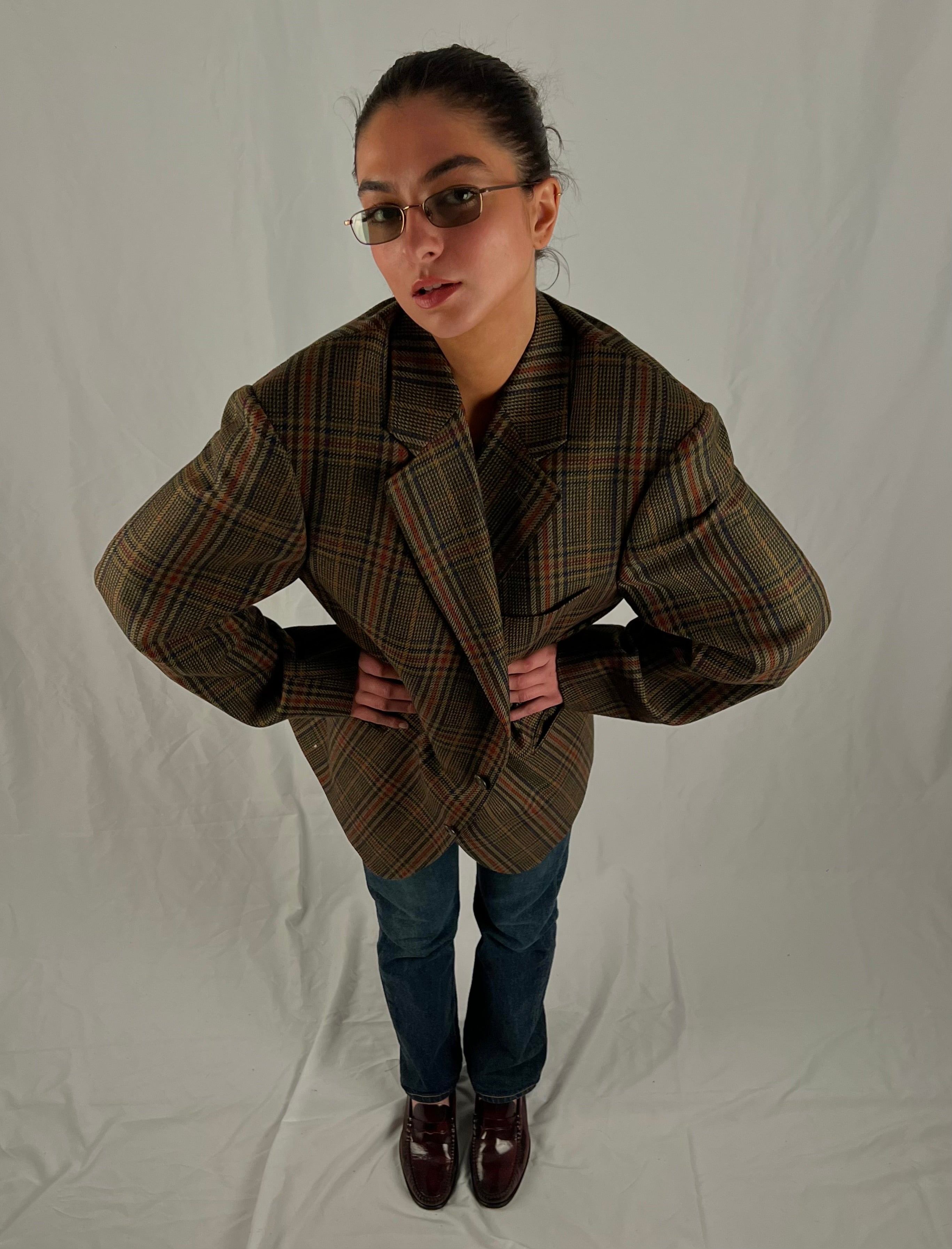 Burberry Checked Khaki Blazer Jacket is a tailored, three-button jacket. Crafted from a wool fabric, it features a classic plaid pattern with thin stripes in shades of red, blue, and yellow on a dark green base. This blazer has a notched lapel, three buttons, and two side pockets. The sleeves are long, and the overall fit is tailored, making it suitable for formal occasions. This jacket is in Good condition.