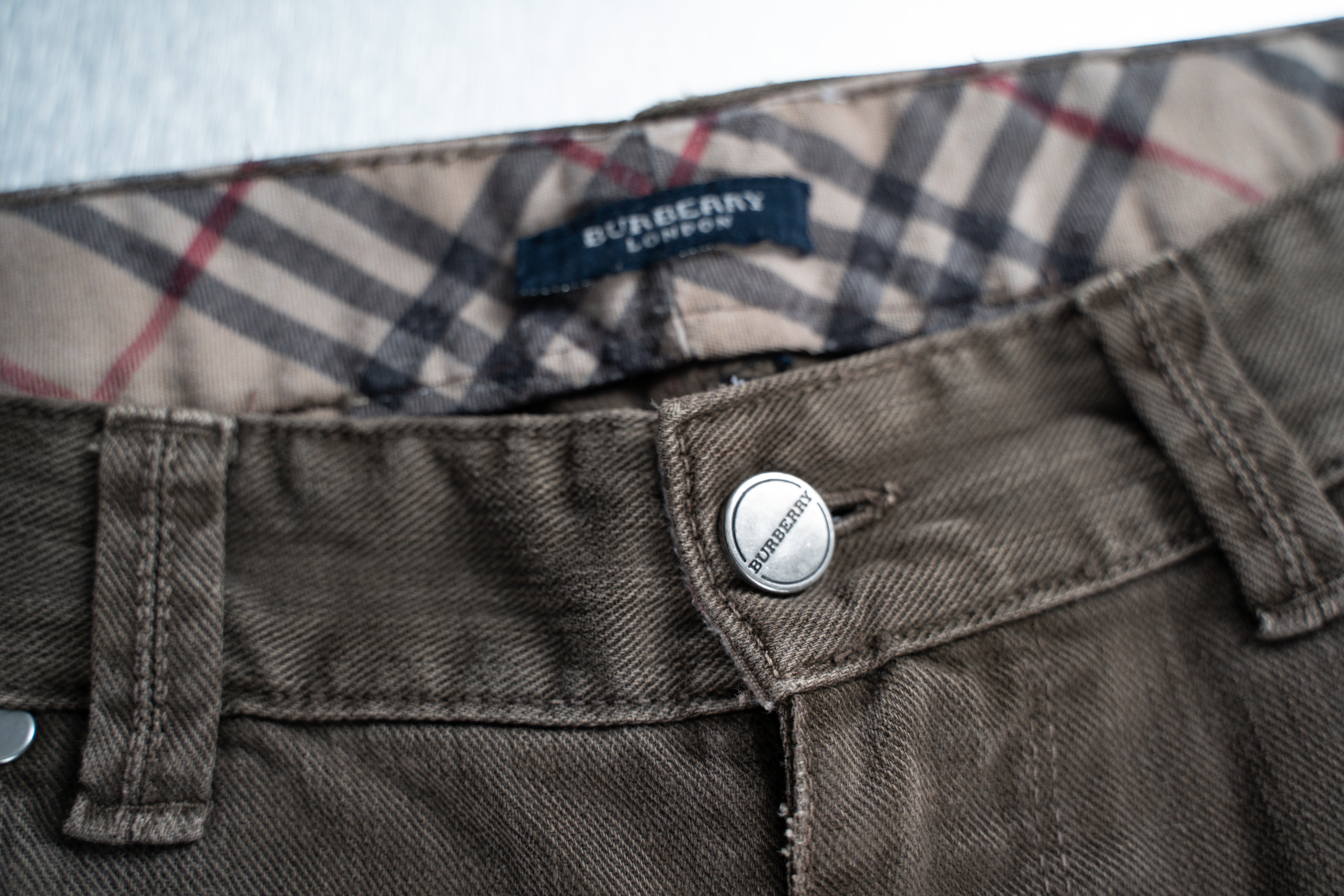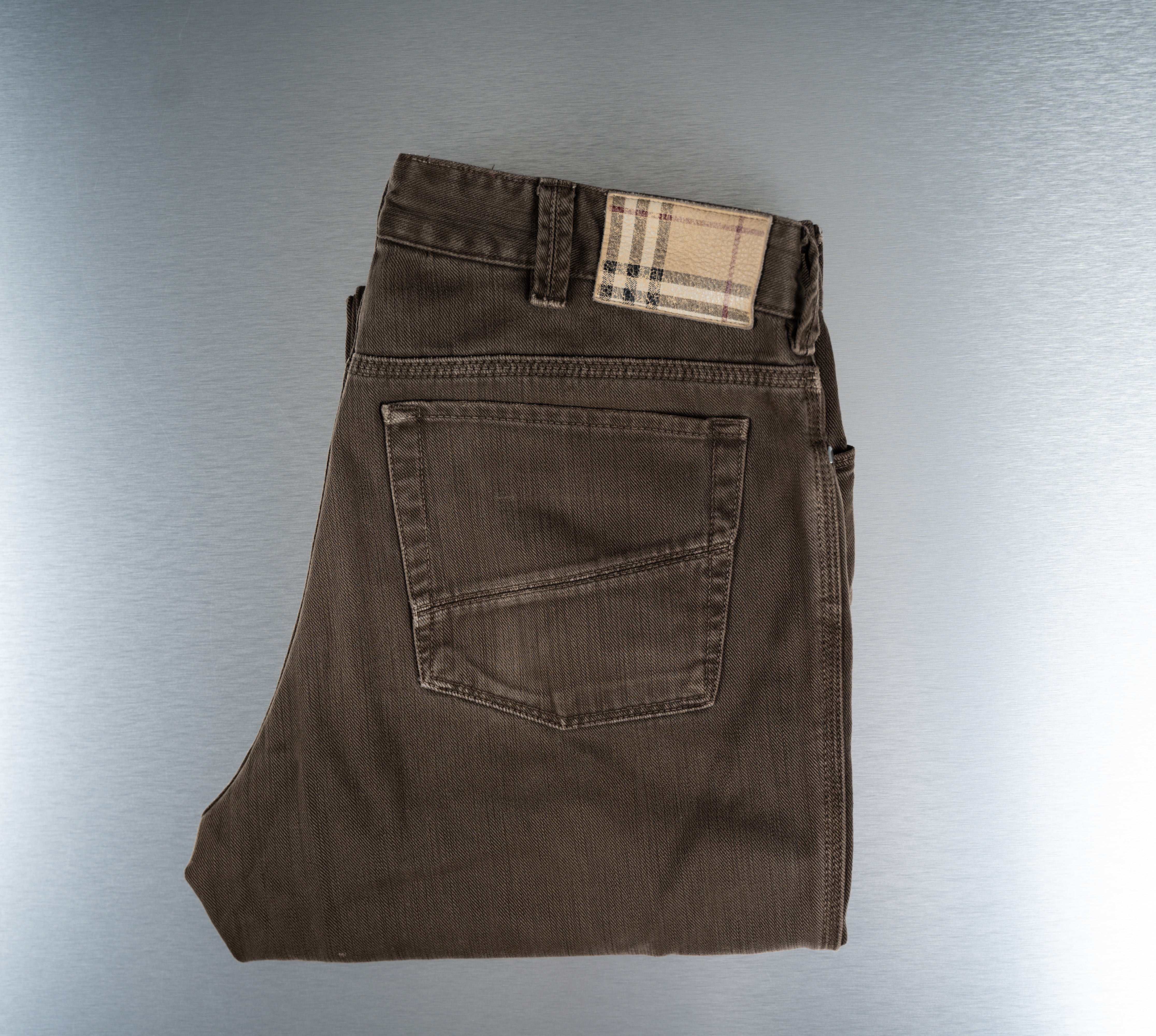 These Burberry Brown Jeans are a classic and versatile choice. Crafted from dark brown corduroy, these straight-leg trousers feature a subtle ribbed texture and a classic five-pocket design. The waistband has a beige, brown, and black plaid pattern on the label. This product is in Good condition.
