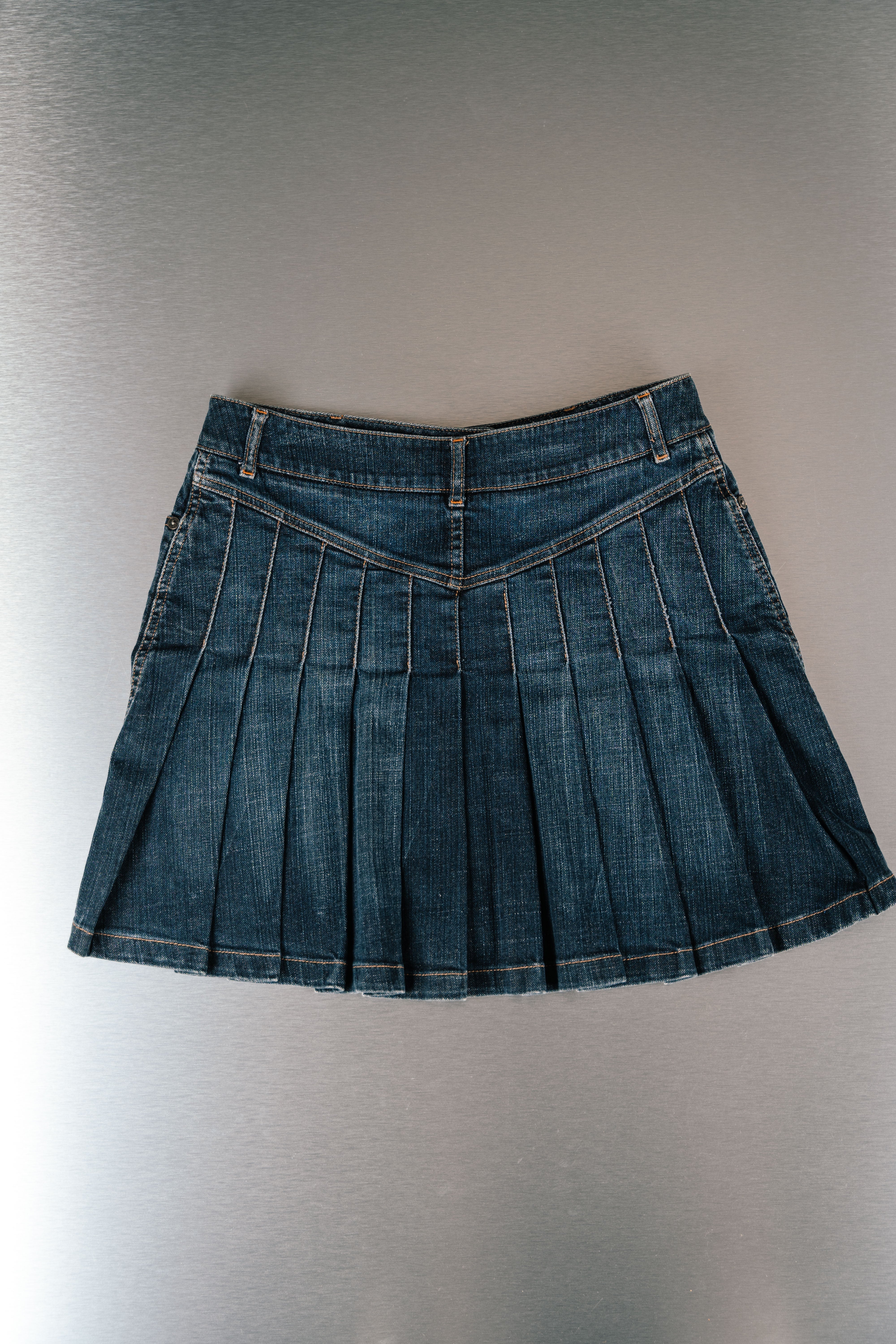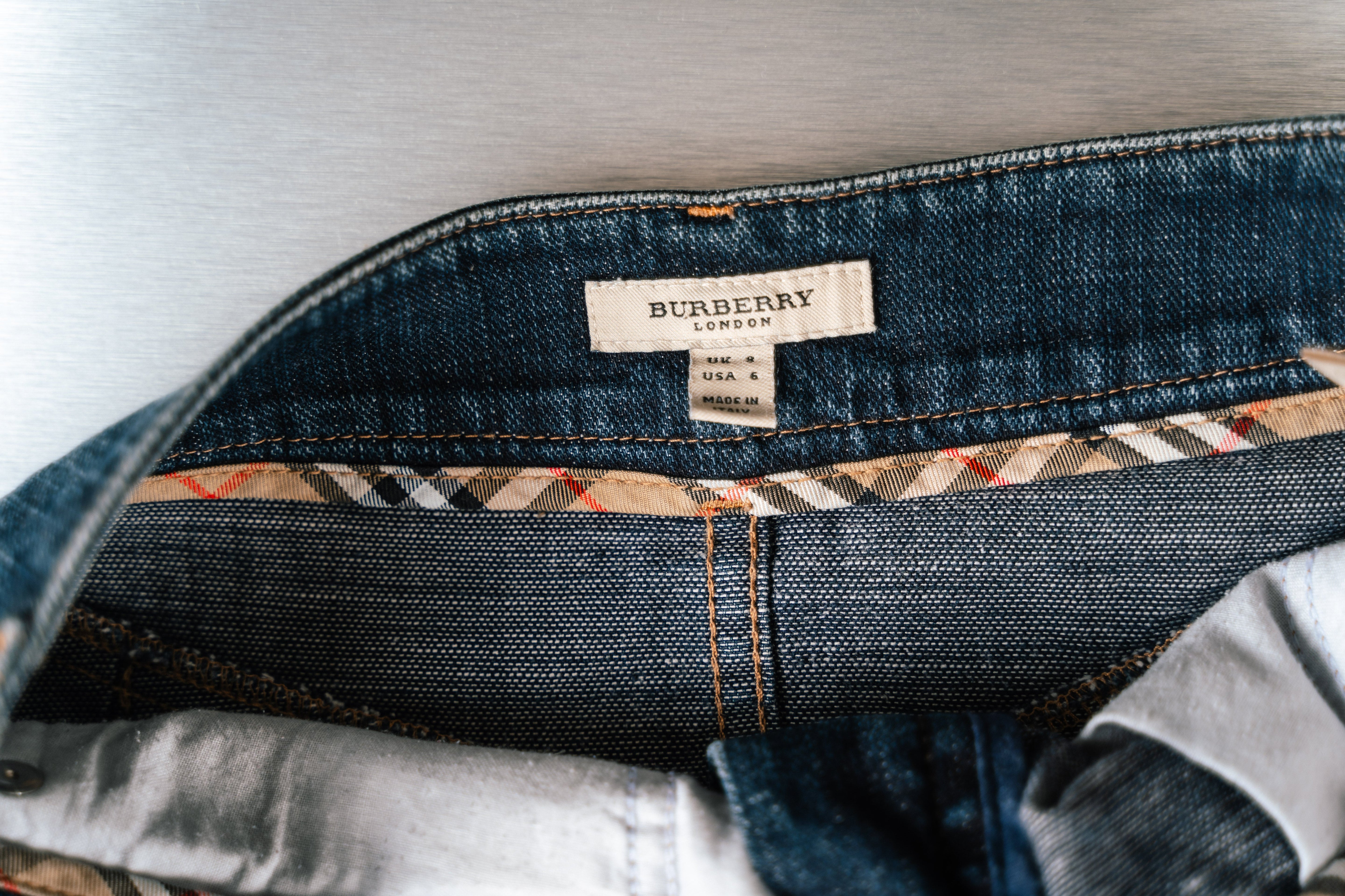 This Jean Mini Skirt Burberry is a stylish and versatile piece for women. Crafted from medium-dark blue denim, this knee-length skirt features a raw hem and a button closure. It has two front pockets and belt loops made from dark denim, complemented by orange stitching. This product is in Good condition.