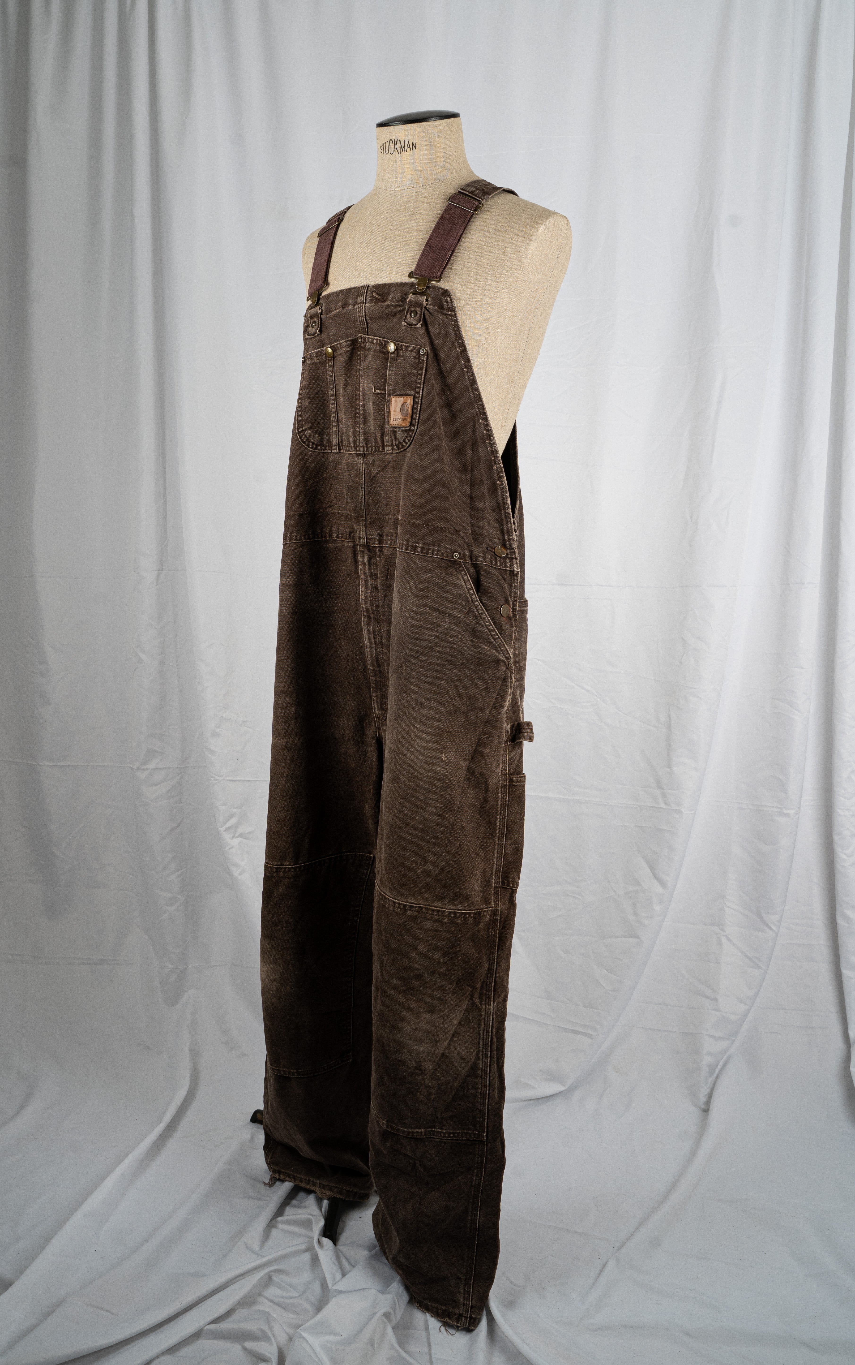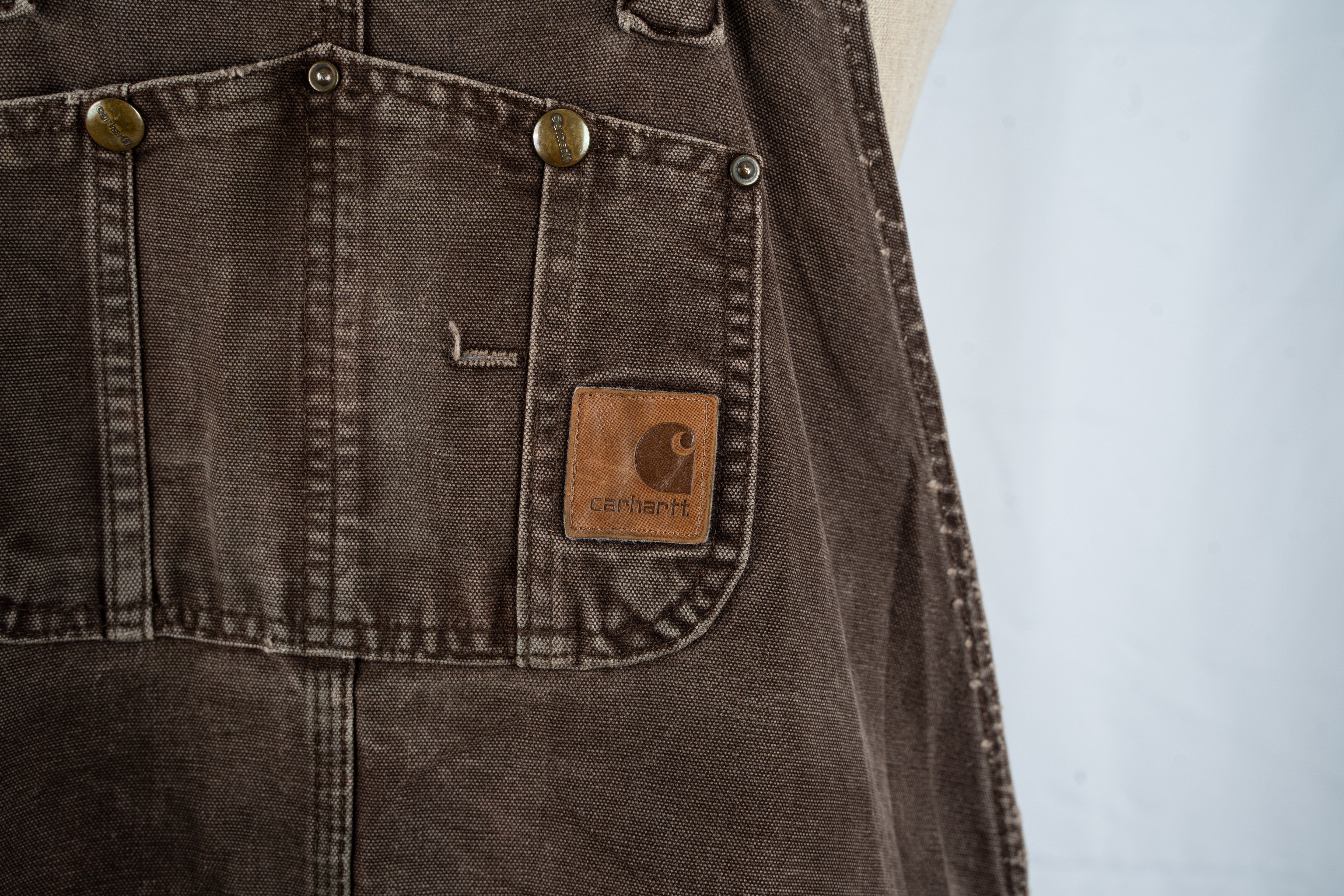 This Brown Jumpsuit Cargo Carhartt is a very rare vintage piece. These men's bib overalls are crafted from durable, dark brown cotton material, likely canvas or denim. They feature adjustable straps with brass buckles, a bib front with a flap closure, and multiple pockets for functionality. This oversized piece is in Good condition.