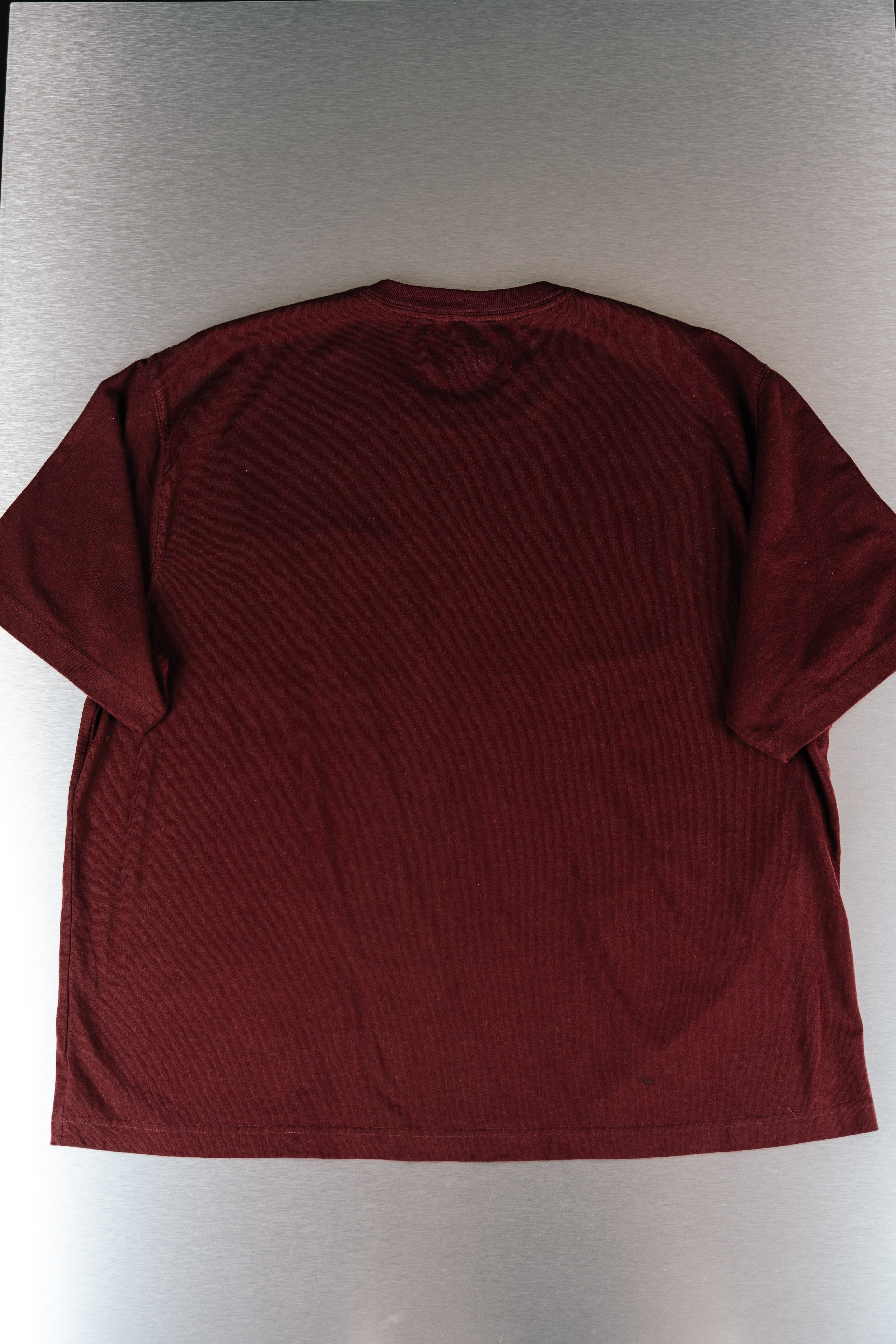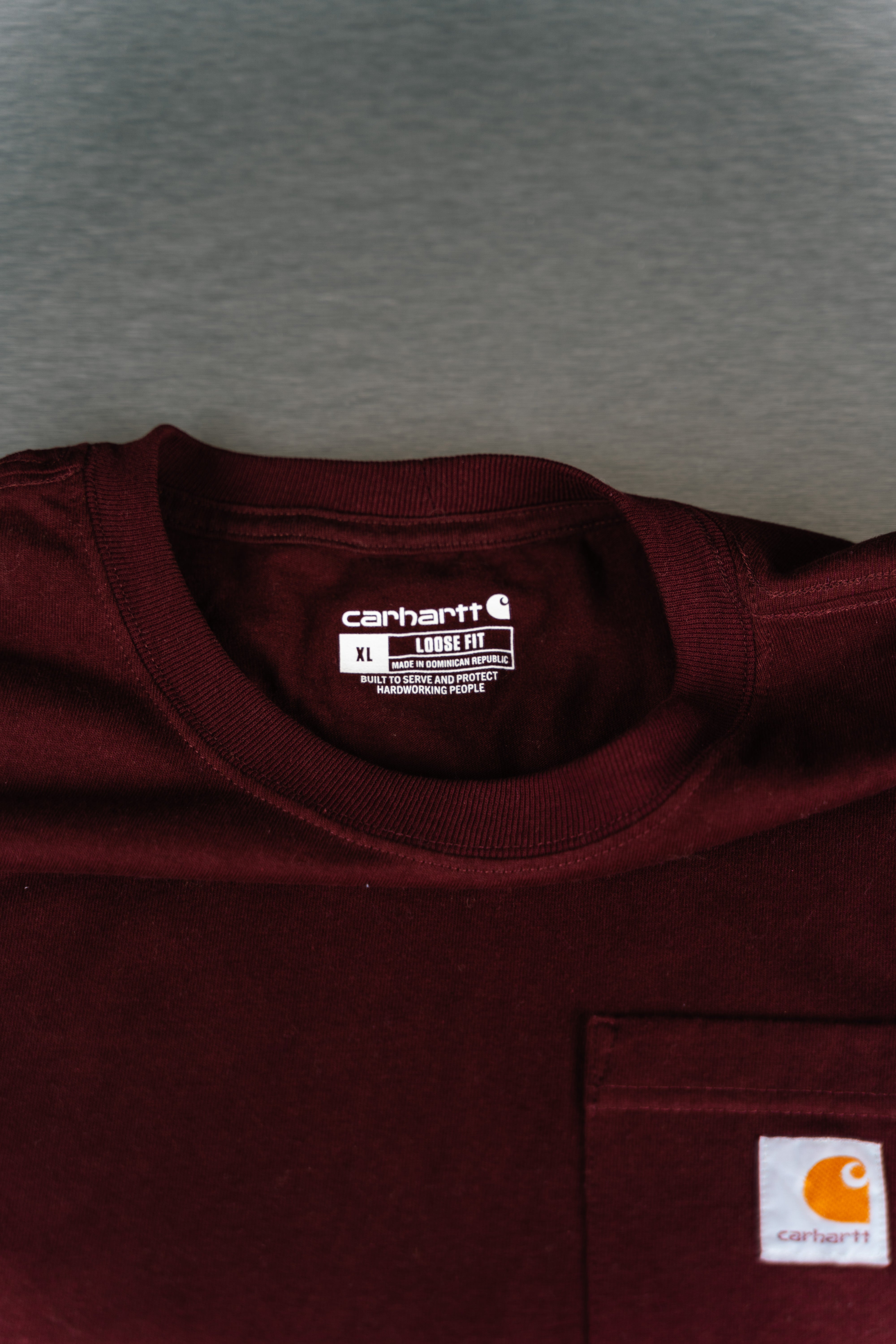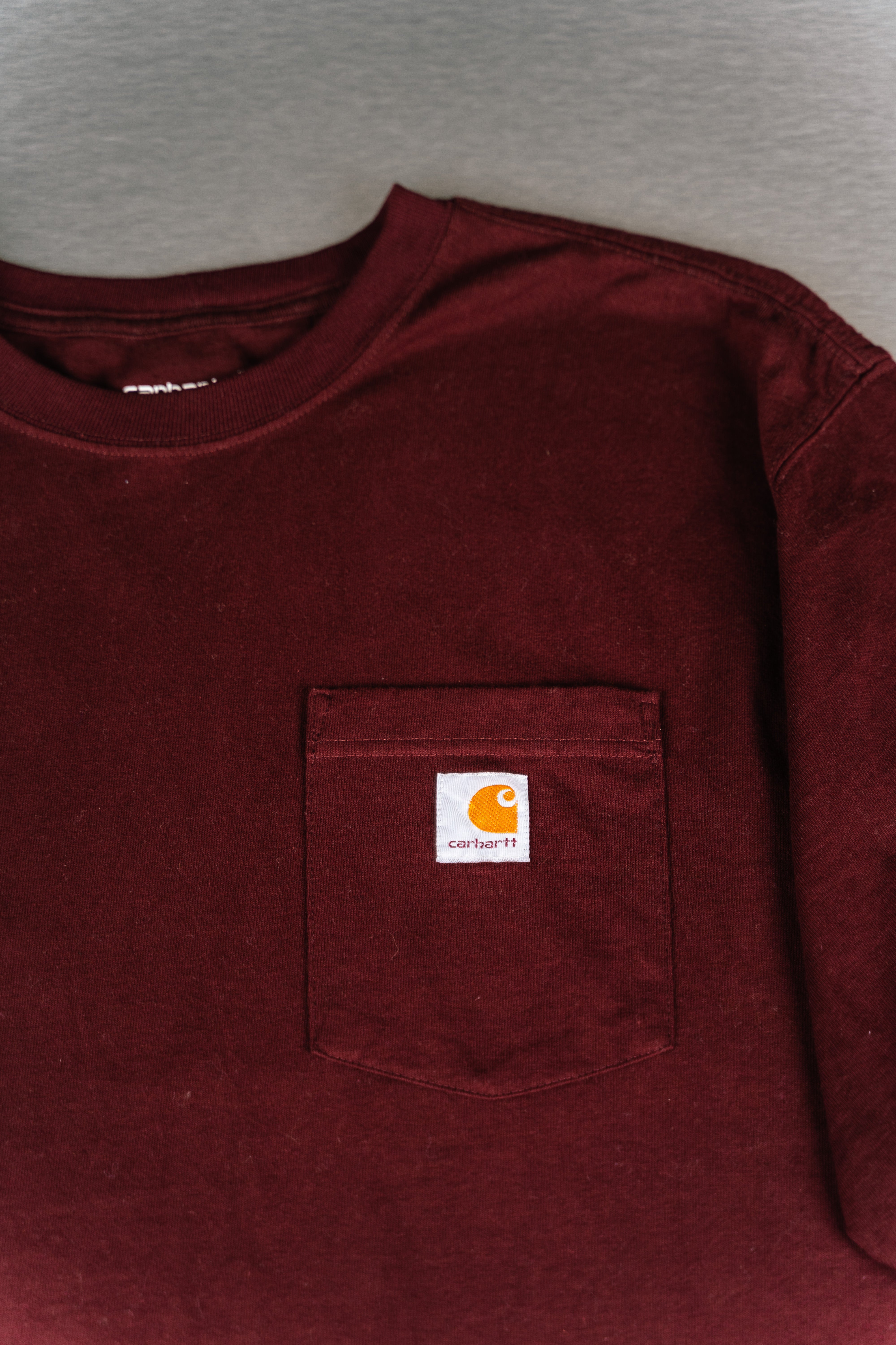 This Carhartt Maroon Short-Sleeved T-Shirt is a classic, straightforward piece. Crafted from maroon cotton, this unisex t-shirt features a crew neck and a left chest pocket. The pocket displays a small white square label with the Carhartt logo in orange and the brand name in black text. This comfortable and durable t-shirt is in Good condition.