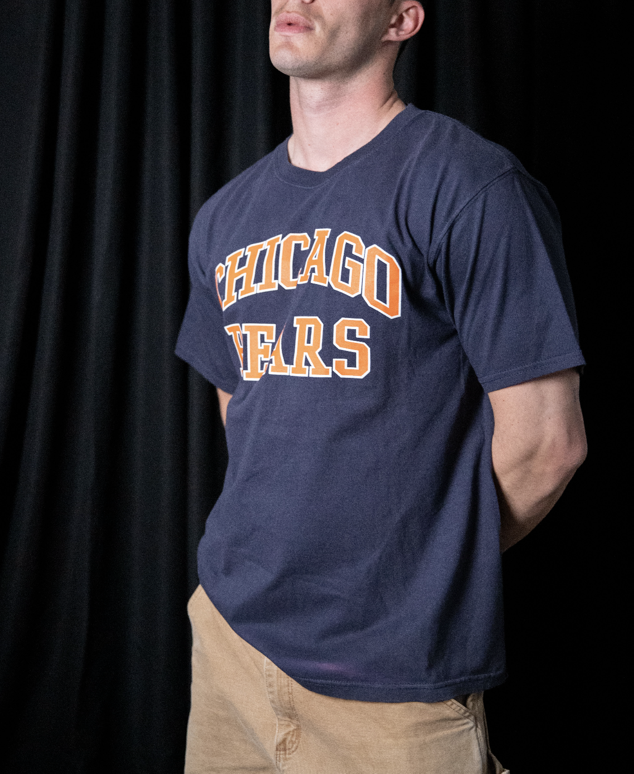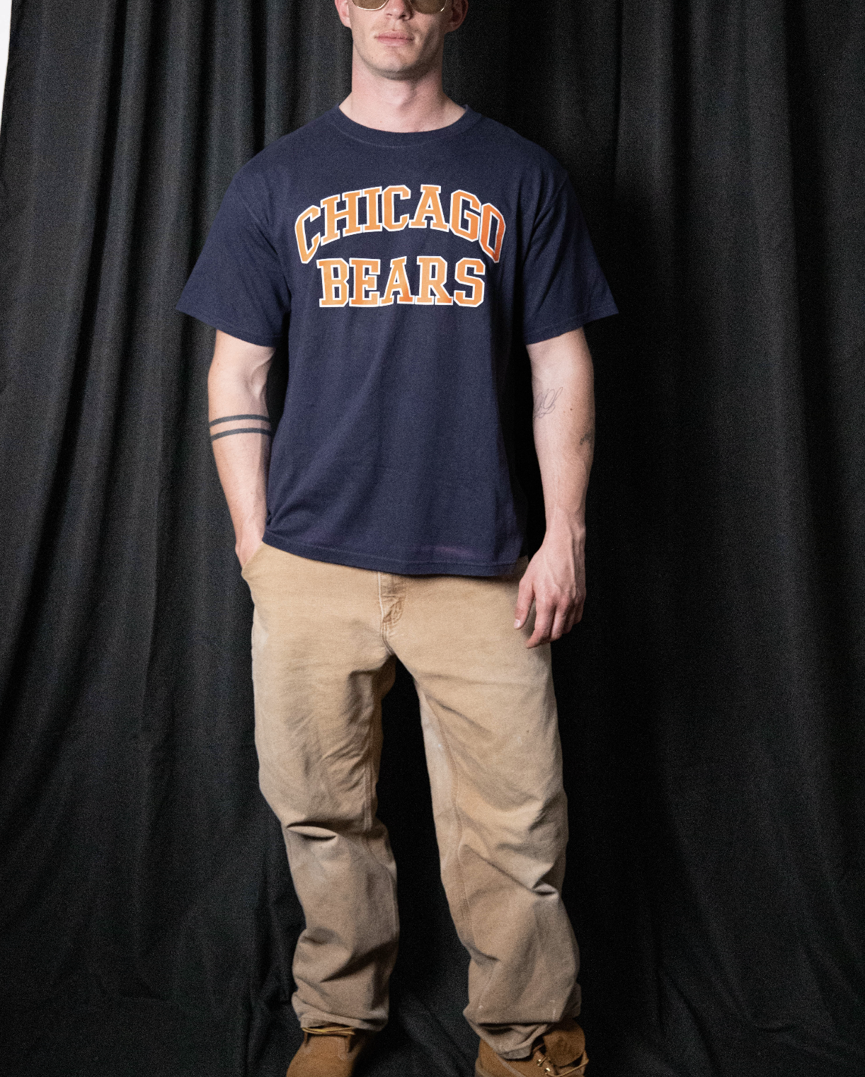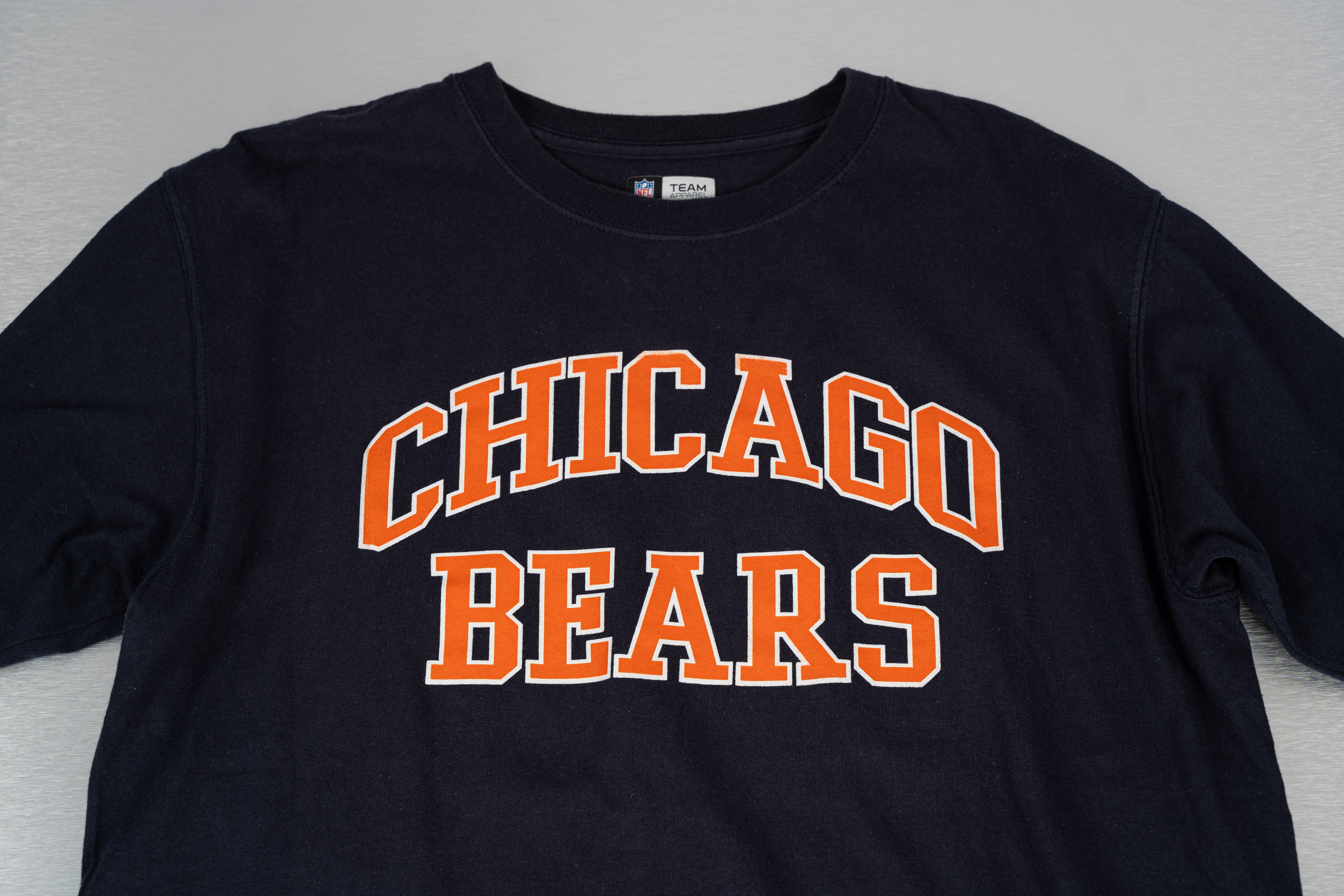 This Chicago Bears Black Short-Sleeved T-Shirt is a casual, sporty piece. Crafted from black cotton, this unisex t-shirt features a crew neck and the words "CHICAGO BEARS" printed on the front in orange letters outlined in white. The text "CHICAGO" is arched above "BEARS". This comfortable t-shirt is in Good condition.