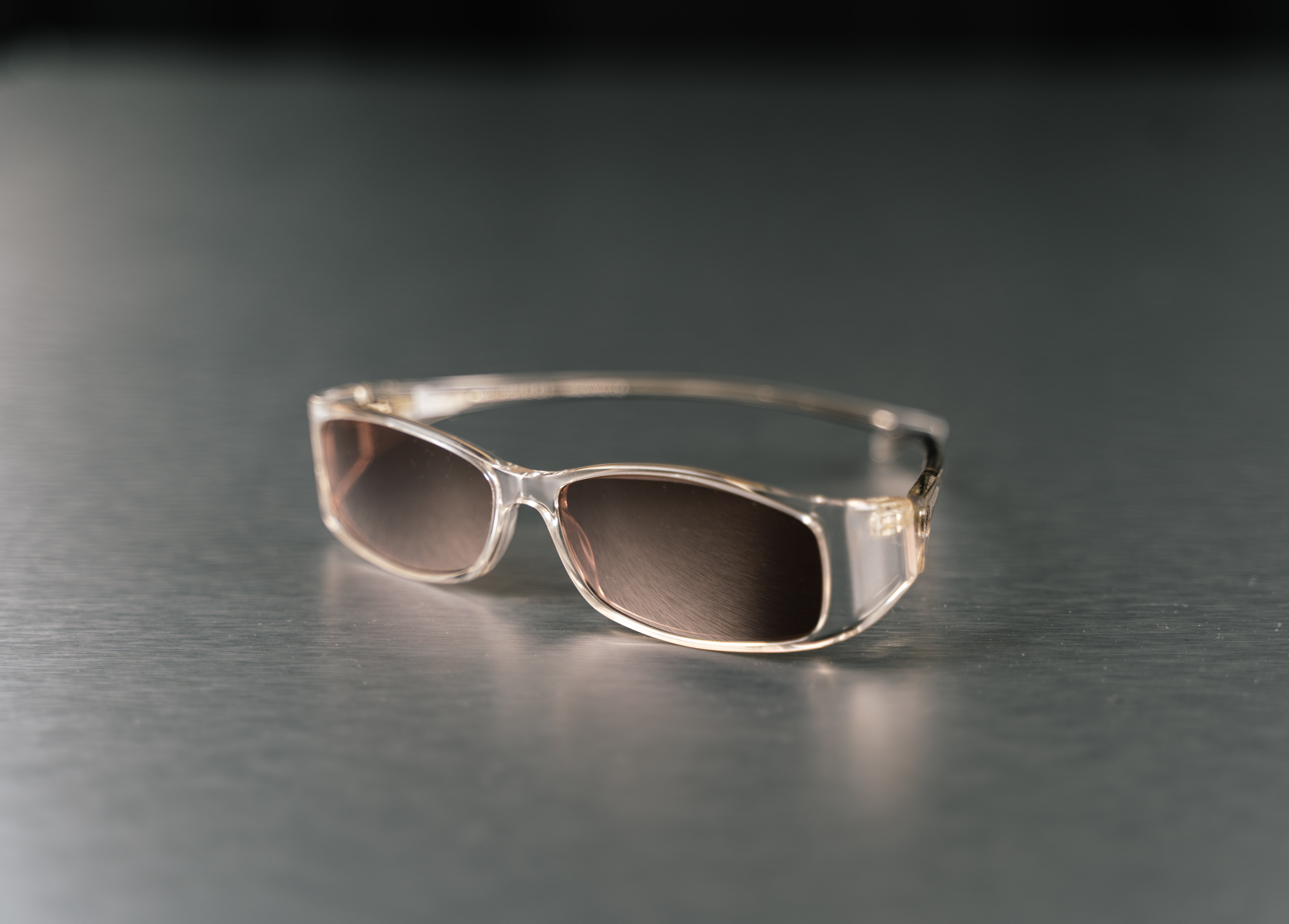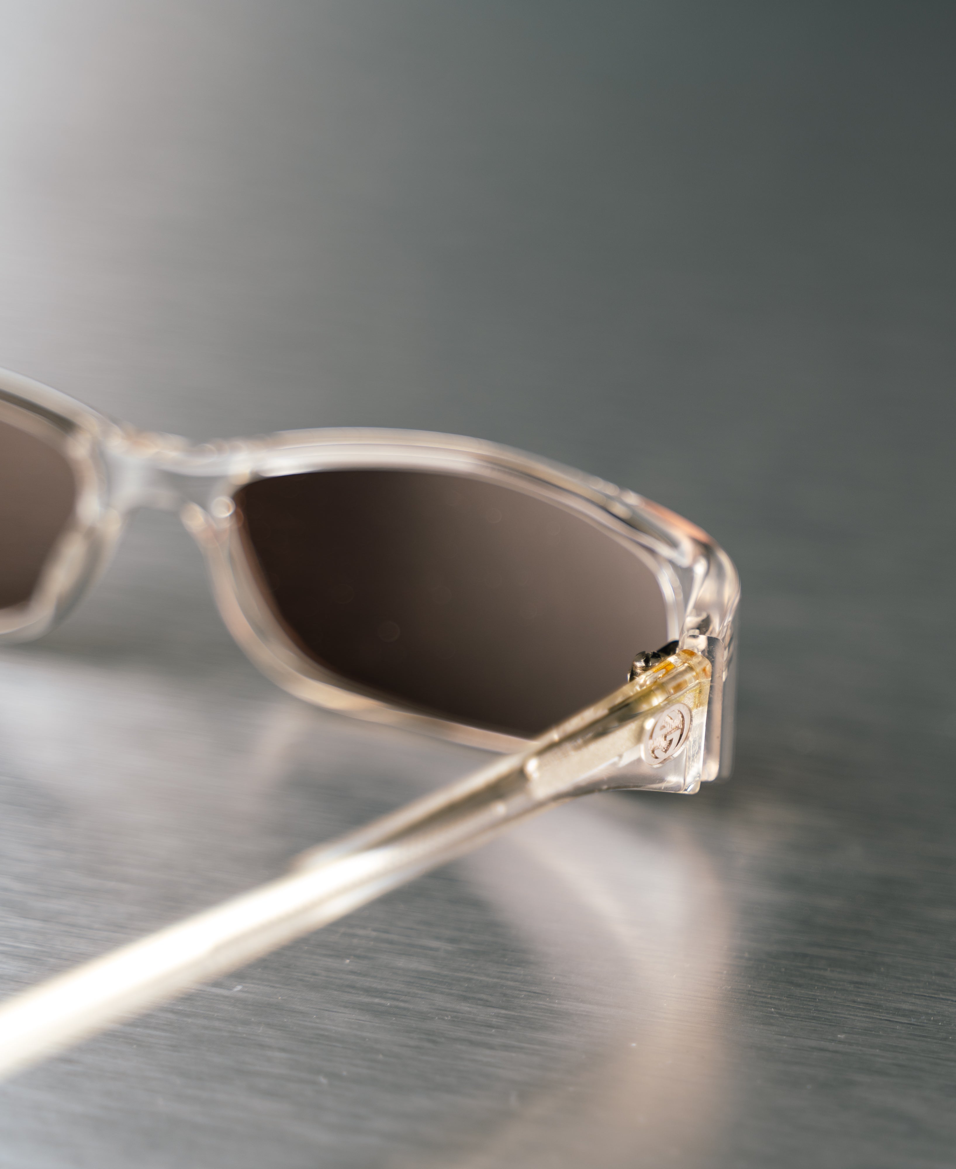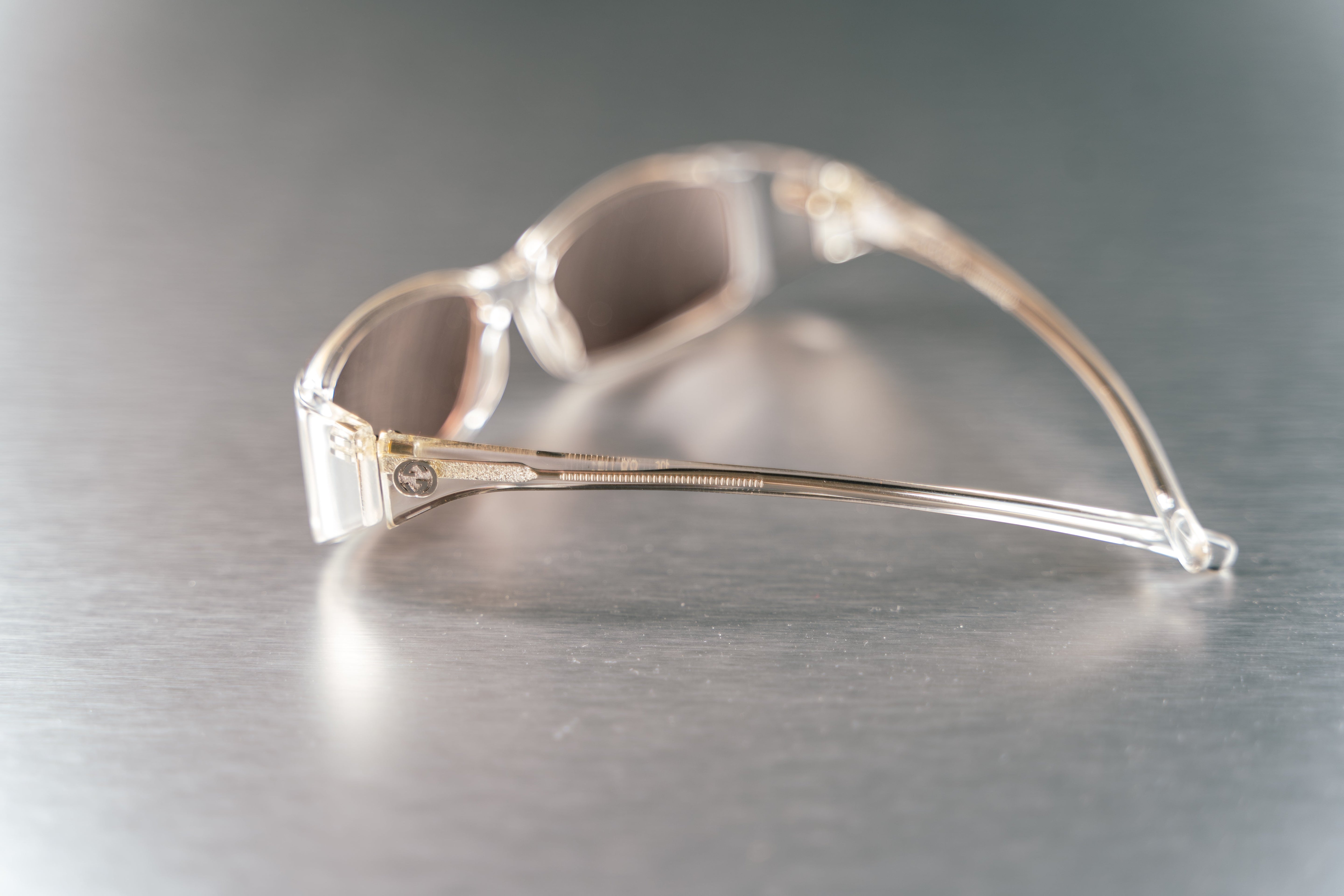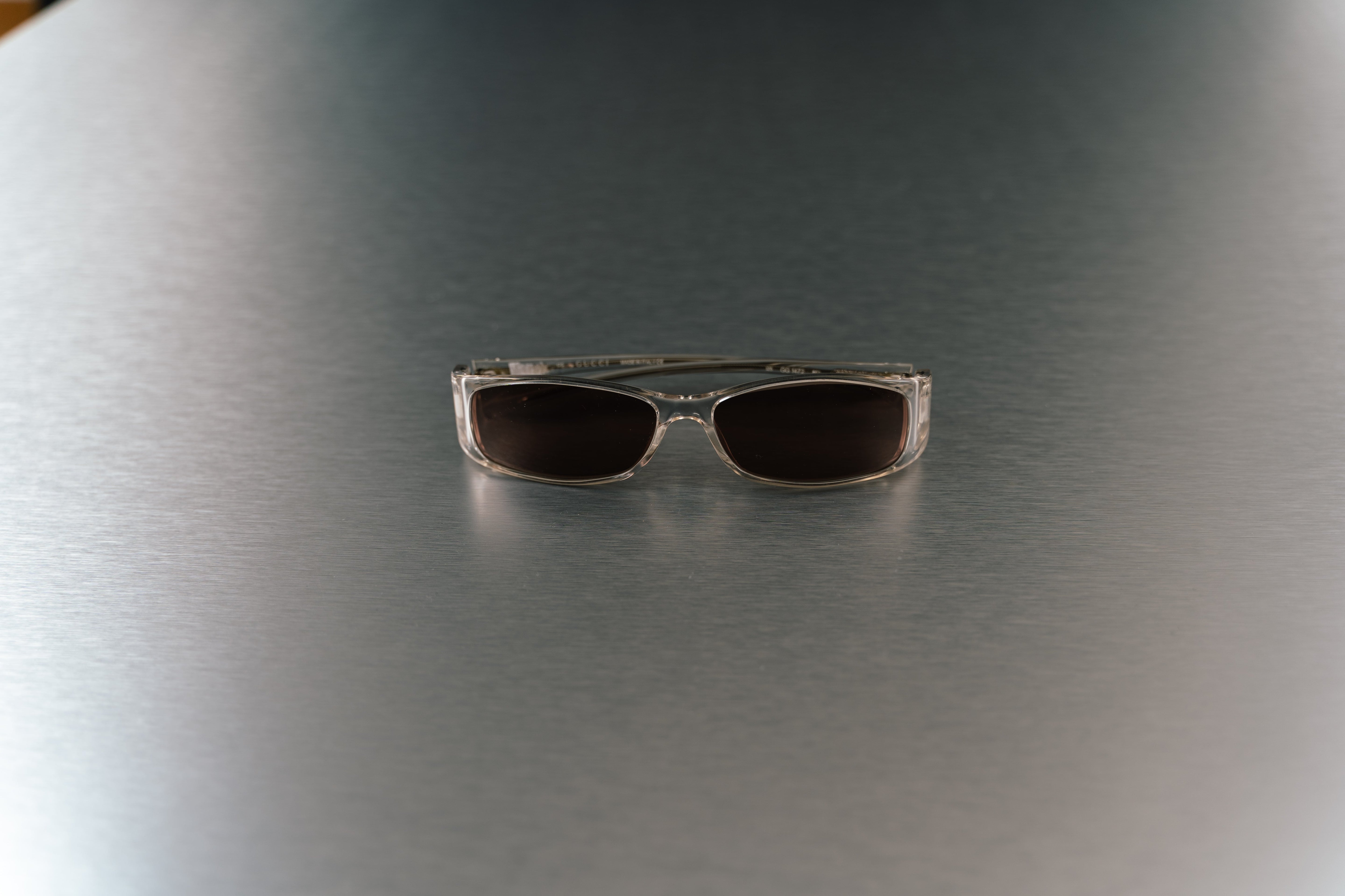 These Gucci Clear Sunglasses are a stylish and versatile accessory. These unisex aviator-style sunglasses feature sleek silver metal frames and brown-tinted lenses. This product is in Excellent condition and does not come with its original box.