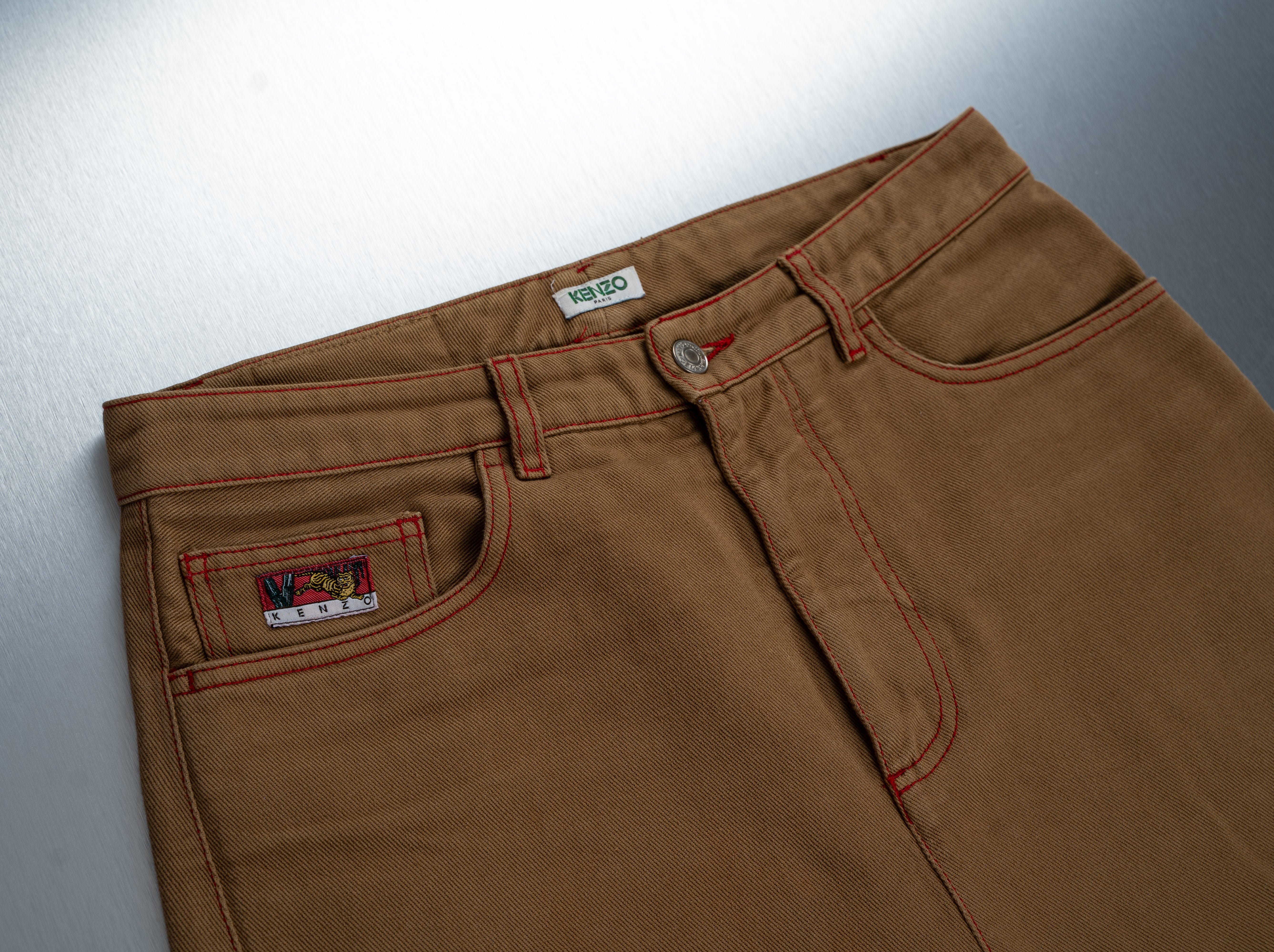 These Kenzo Jeans are a stylish and unique choice for men. Crafted from durable camel brown canvas, these straight-leg jeans feature eye-catching red stitching throughout. A brown leather label on the waistband displays the "KENZO PARIS" brand name. This product is in Good condition.