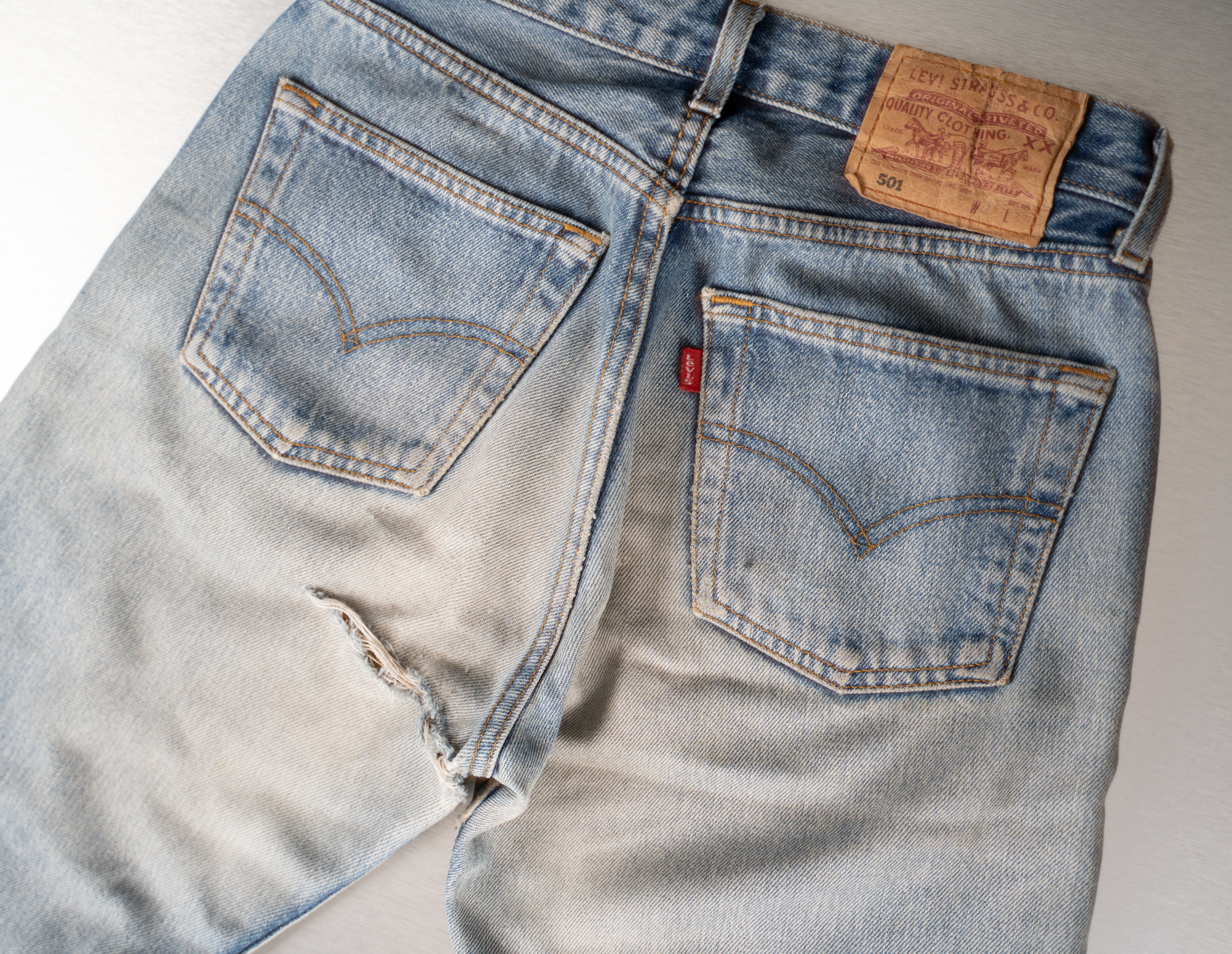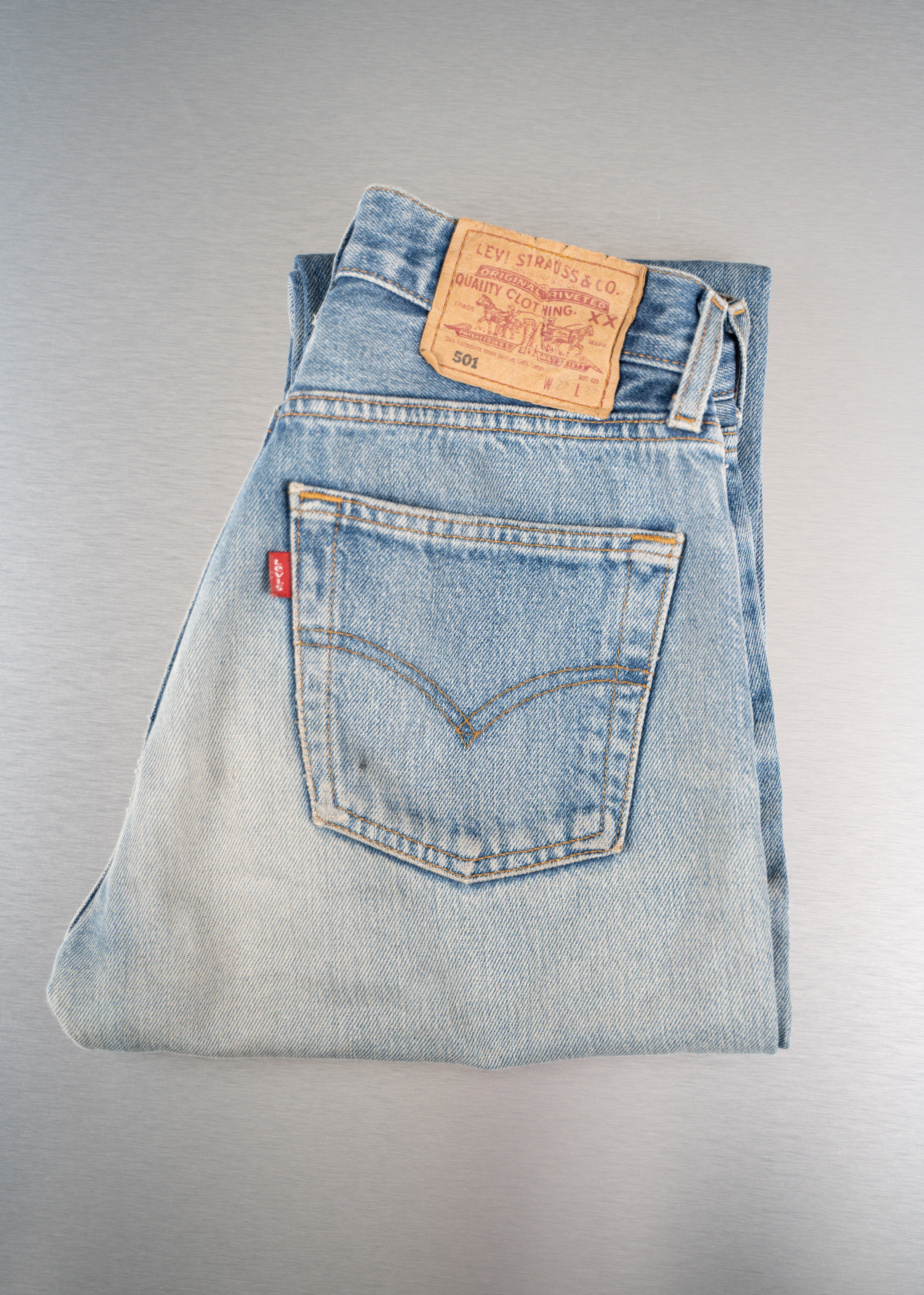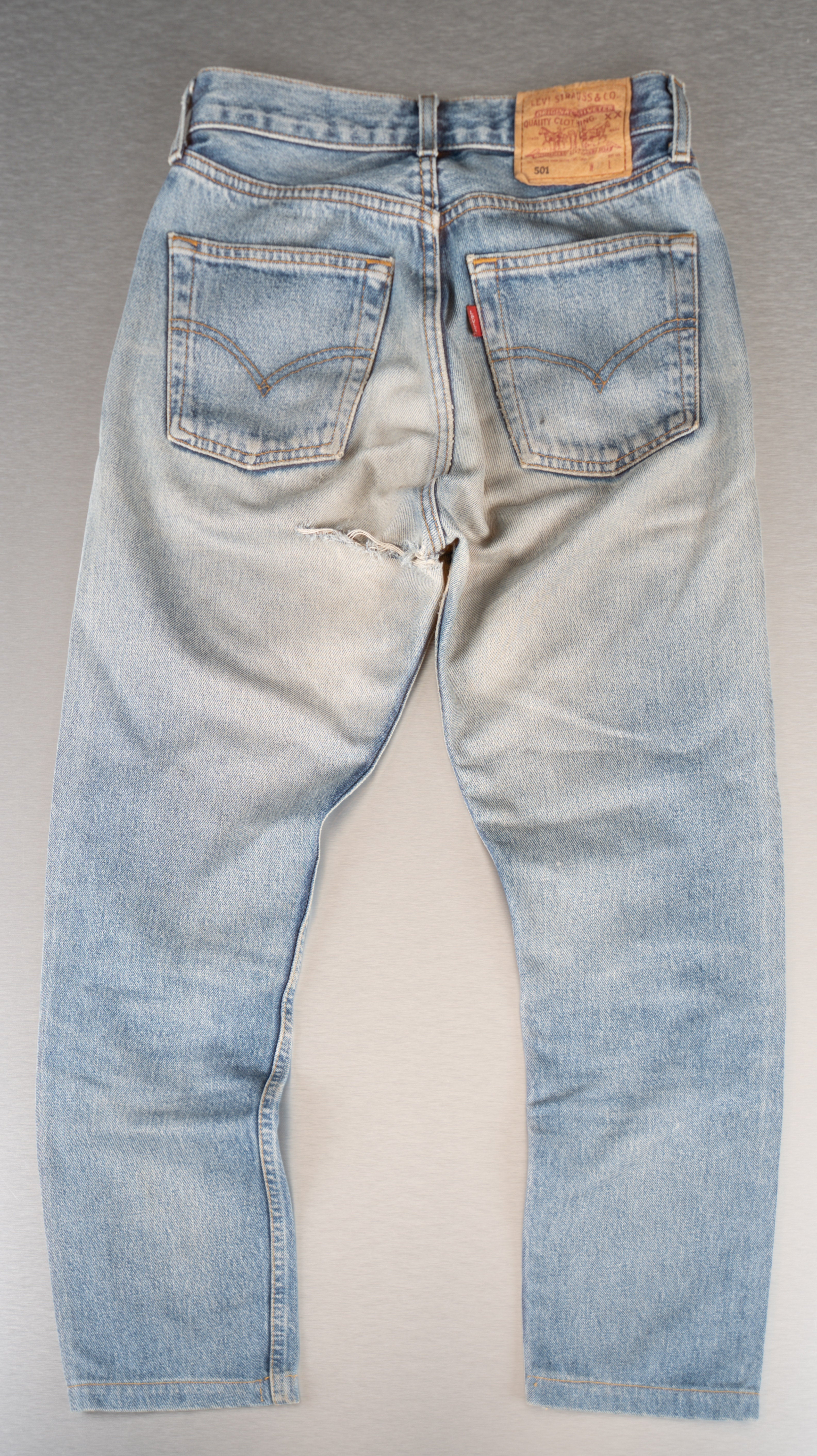These Levi's 501 Jeans are a classic and comfortable choice for men. Crafted from light blue denim, these straight-leg jeans feature fading around the thighs and knees for a worn-in look. They have a classic five-pocket design with a distinctive curved stitching pattern on the back right pocket, and the iconic red tab and Levi's branded leather label on the waistband. This product is in Good condition, with a cut under the bottom.
