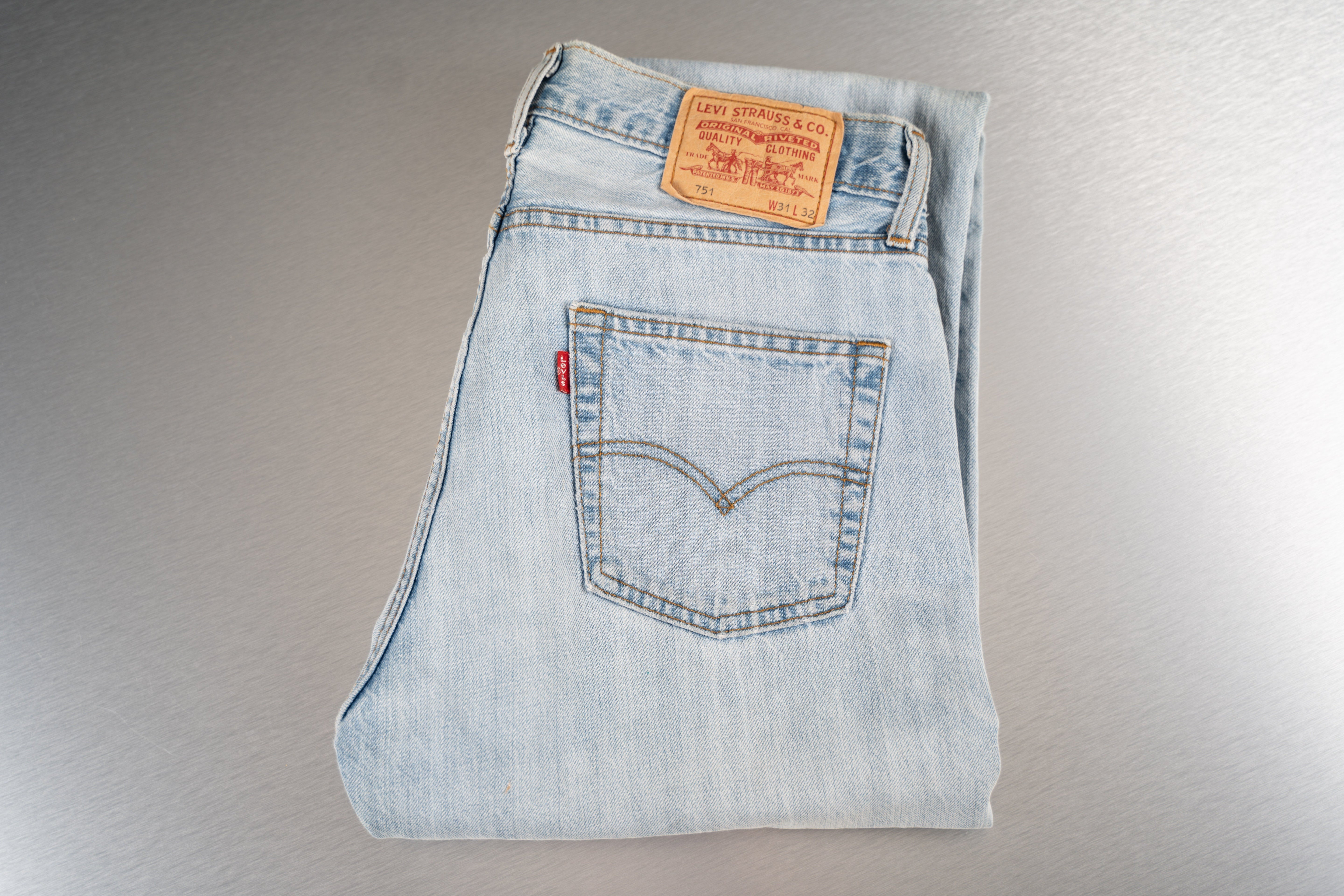 These Levi's 751 Jeans are a classic and comfortable choice for women. Crafted from light blue denim, these straight-leg jeans feature a light wash and a frayed hem at the waistband. They have a classic five-pocket design with a distinctive red tab on the back right pocket and an orange leather patch on the waistband with "Levi's" branding. This product is in Good condition.