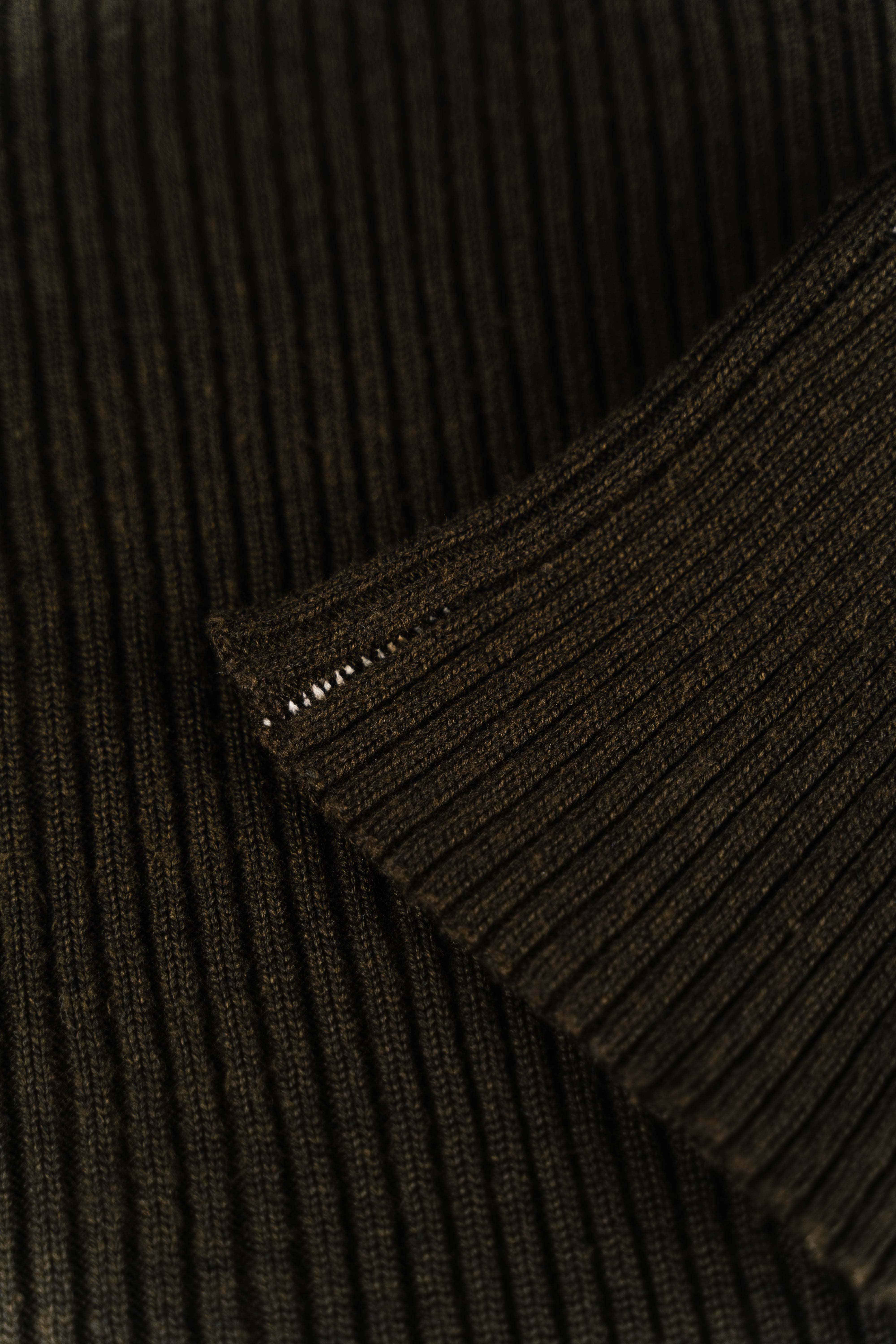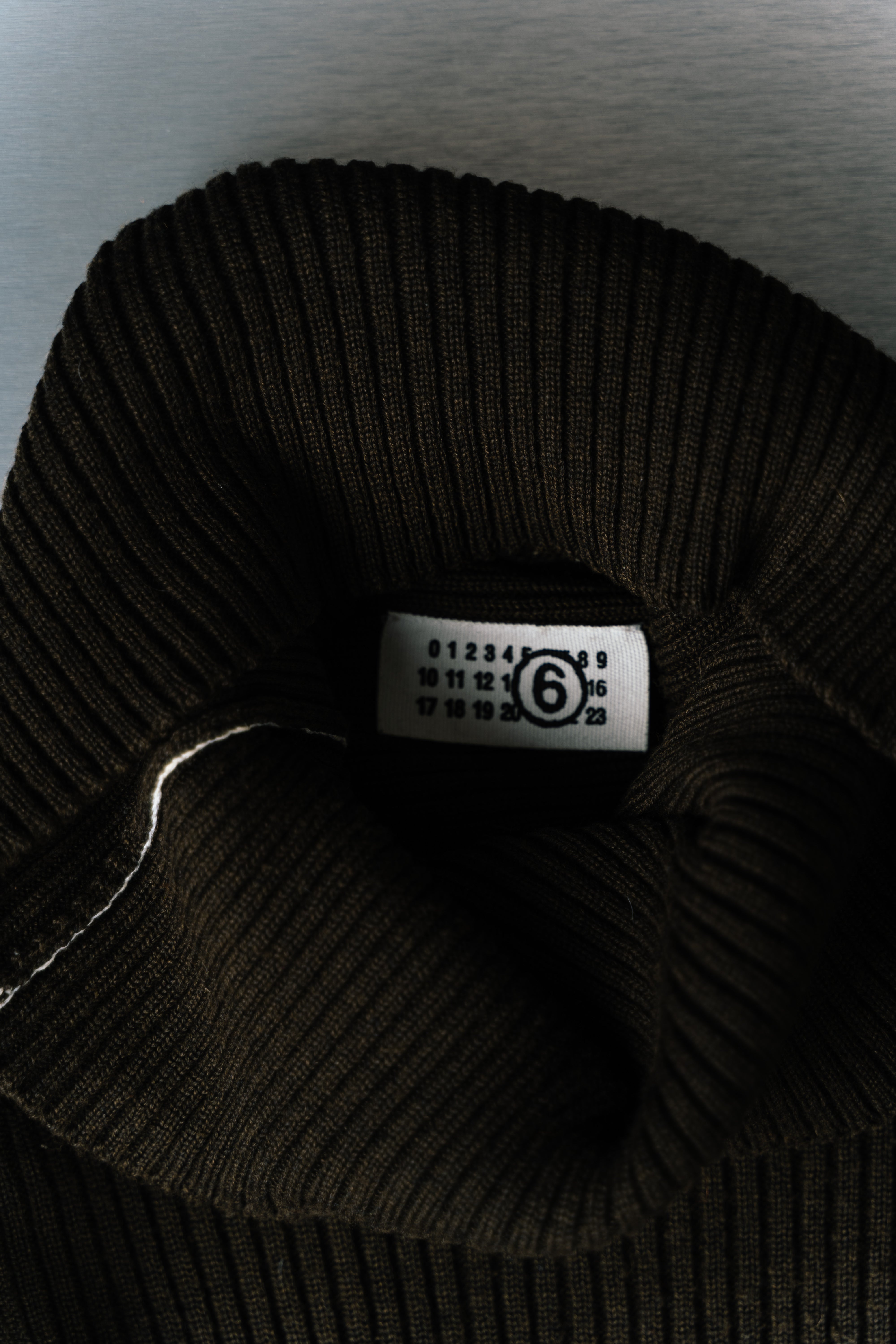 This Margiela Brown Khaki Sweater is a stylish and comfortable piece for women. Crafted from thick, ribbed dark brown knitted wool or acrylic, this turtleneck sweater features a folded collar and long sleeves. This product is in Good condition.
