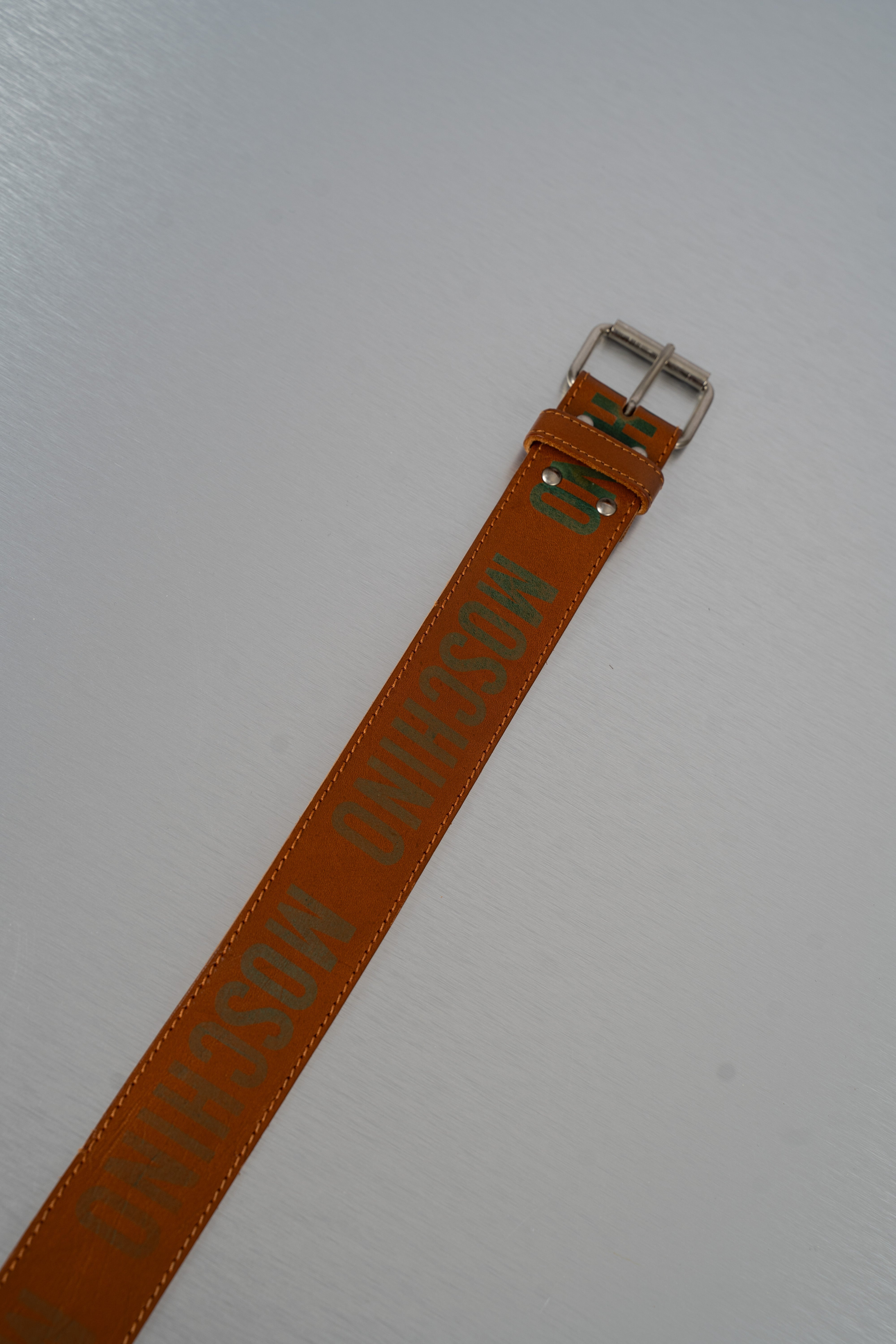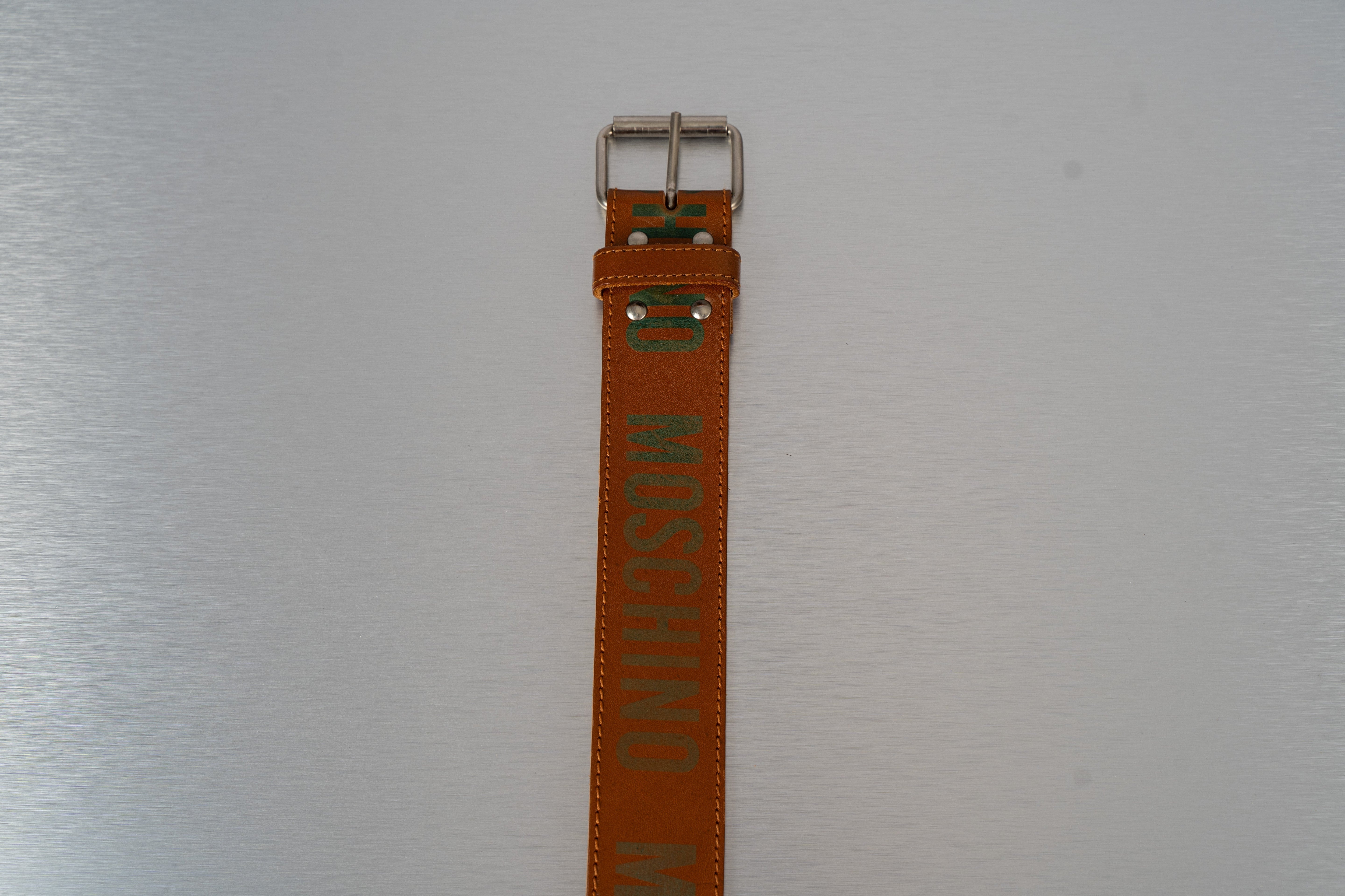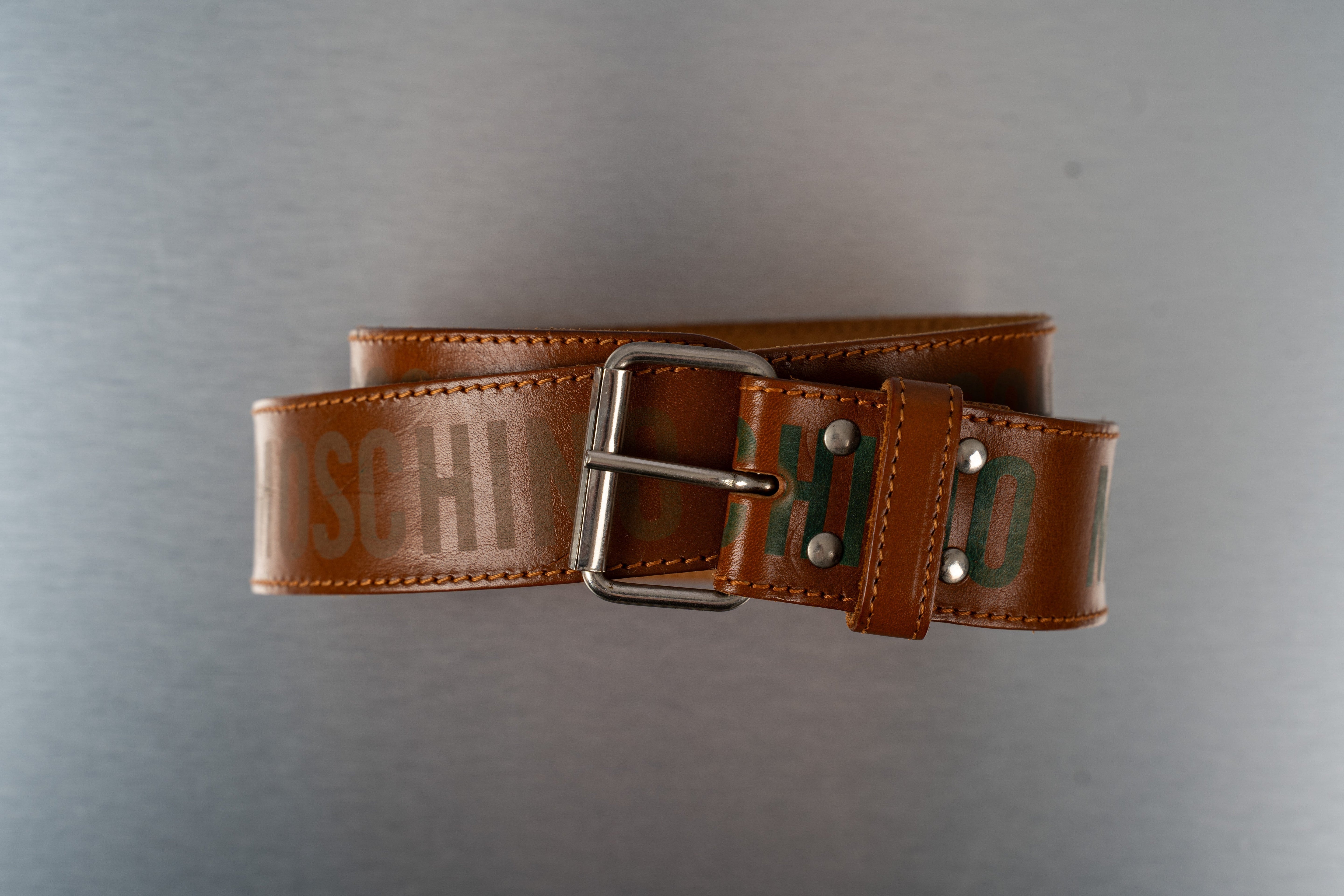 This Moschino Brown Leather Belt is a stylish accessory from the 2000s. Crafted from rich brown leather, it features a prominent silver buckle and silver rivets. Unique green lettering, reading "HID" and "D", is visible on the strap. The belt is stitched along its edges with brown thread, showcasing a classic leather strap design suitable for formal or casual wear. This belt is in Good condition and has a length of 85cm.