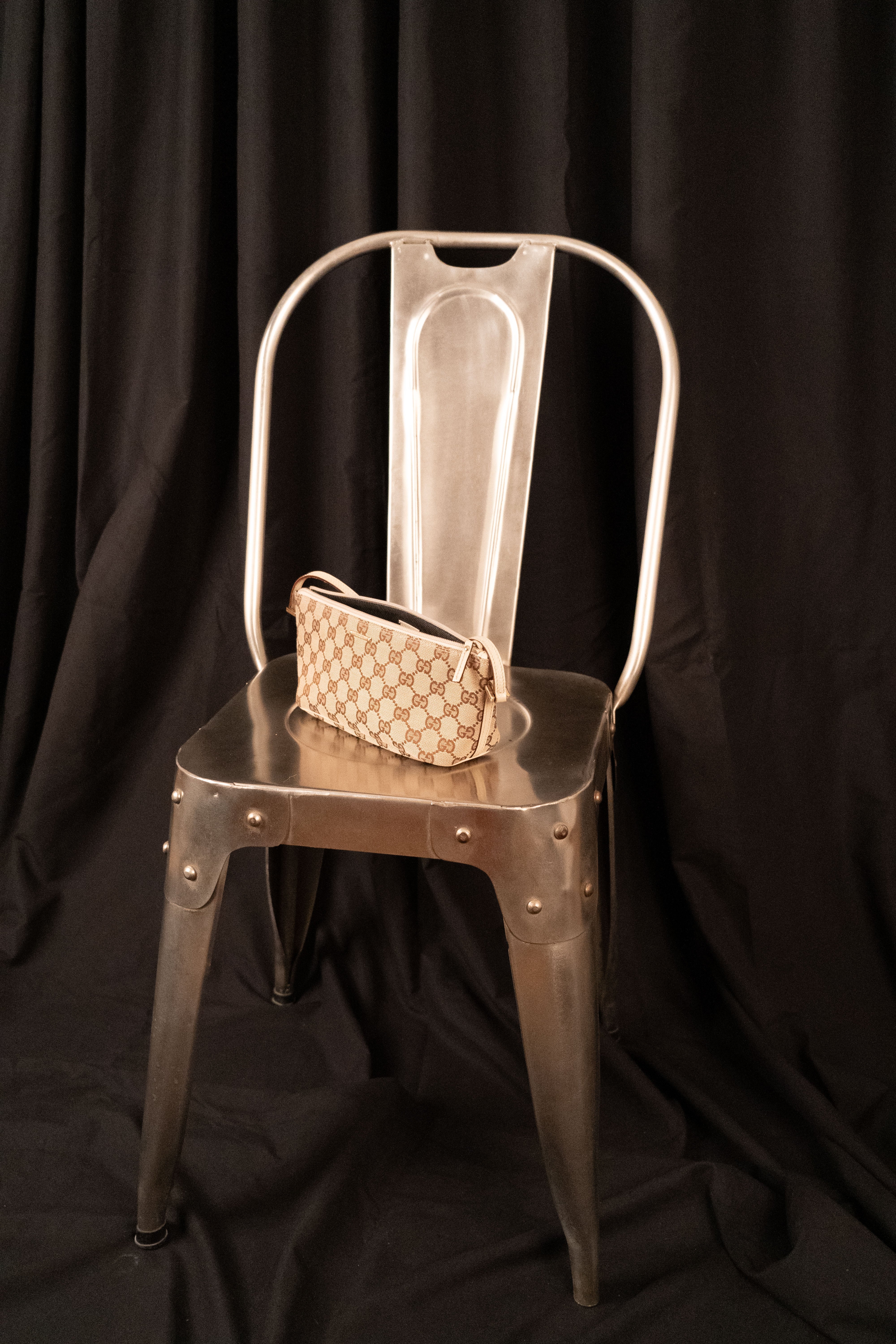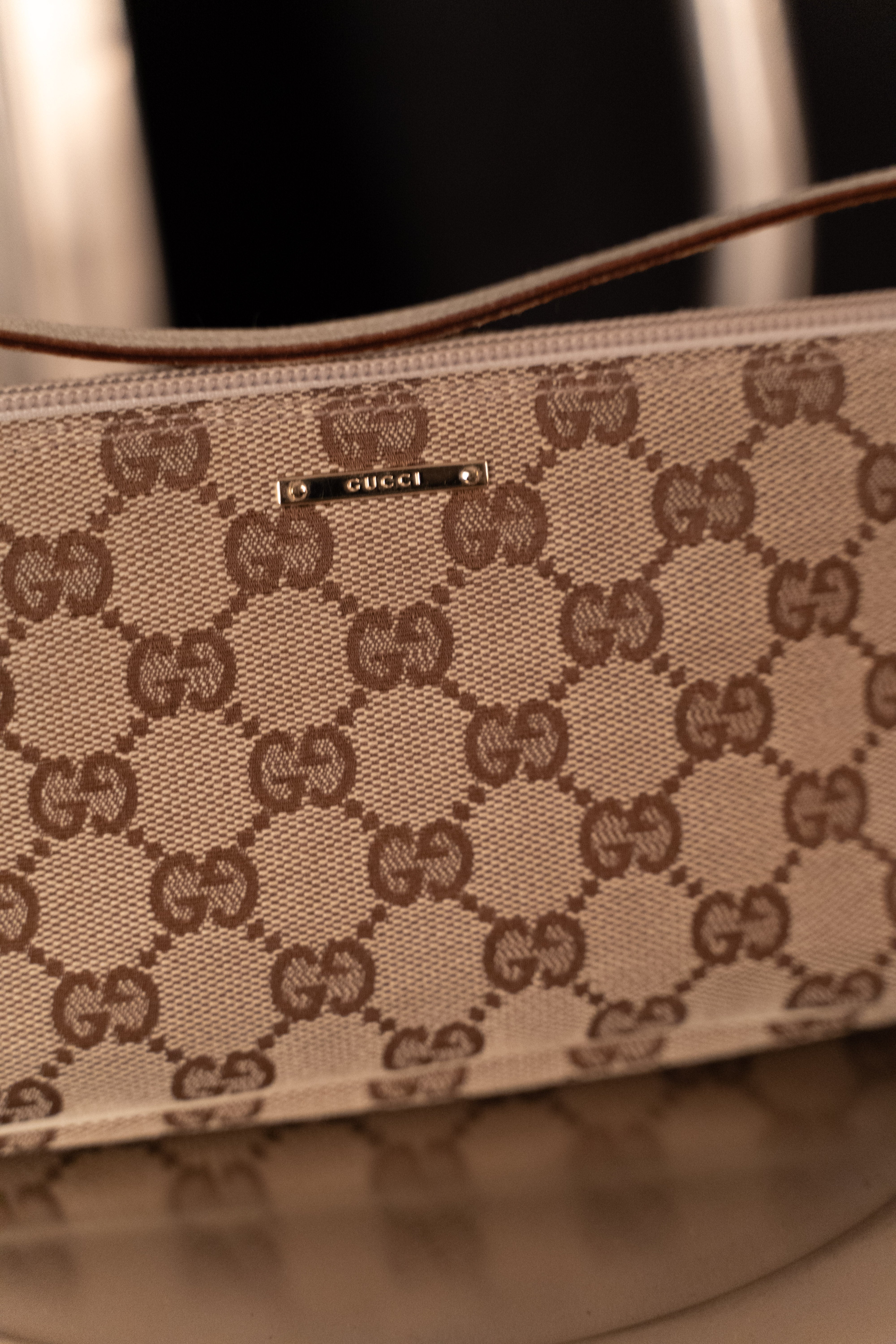 This Vintage Gucci Canvas Monogram Handbag is a rectangular, beige and brown accessory with a wrist strap. The bag is made from a beige fabric featuring the classic Gucci monogram pattern in brown, with a repeating design of interlocking 'G's. It has a small, white, horizontal logo on the front. Crafted from a sturdy, canvas-like material, likely cotton or a cotton blend, this handbag features a zippered top and a beige wrist strap. This handbag is in Good condition.