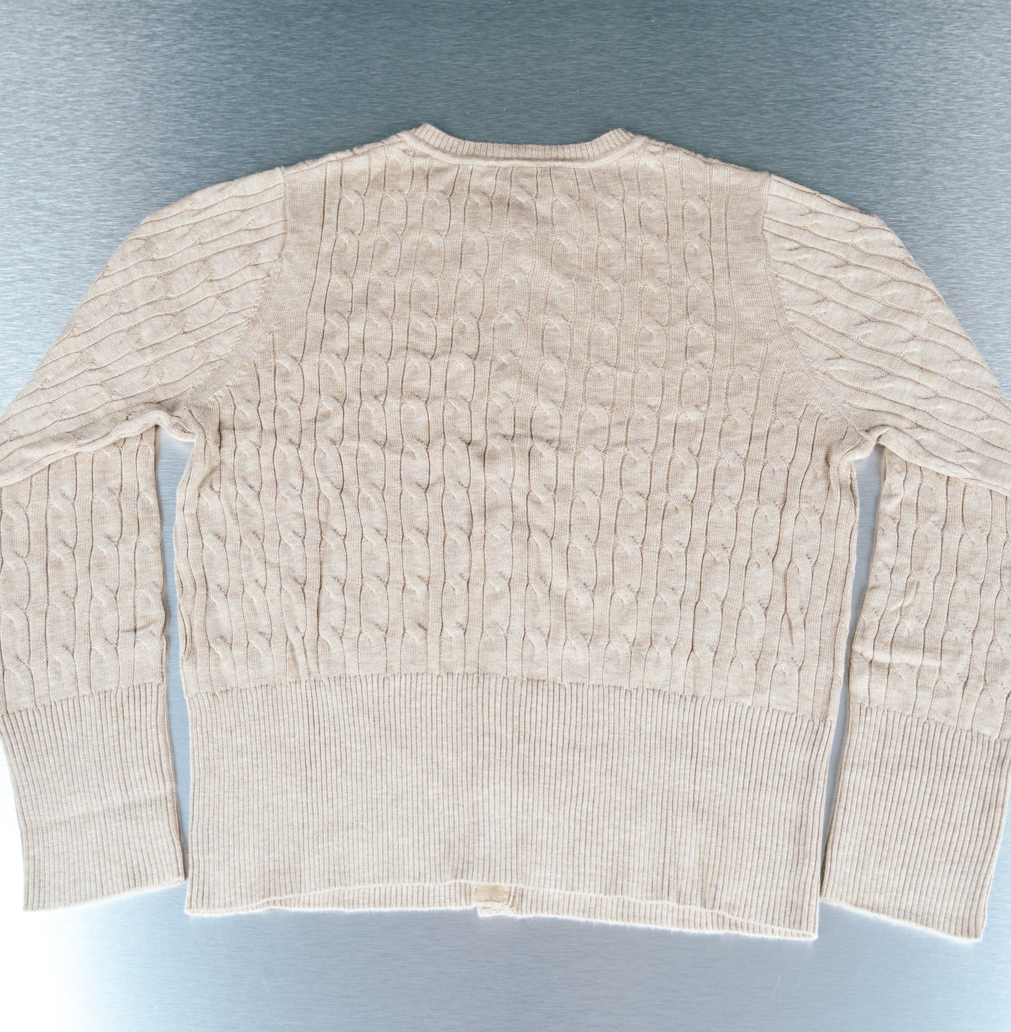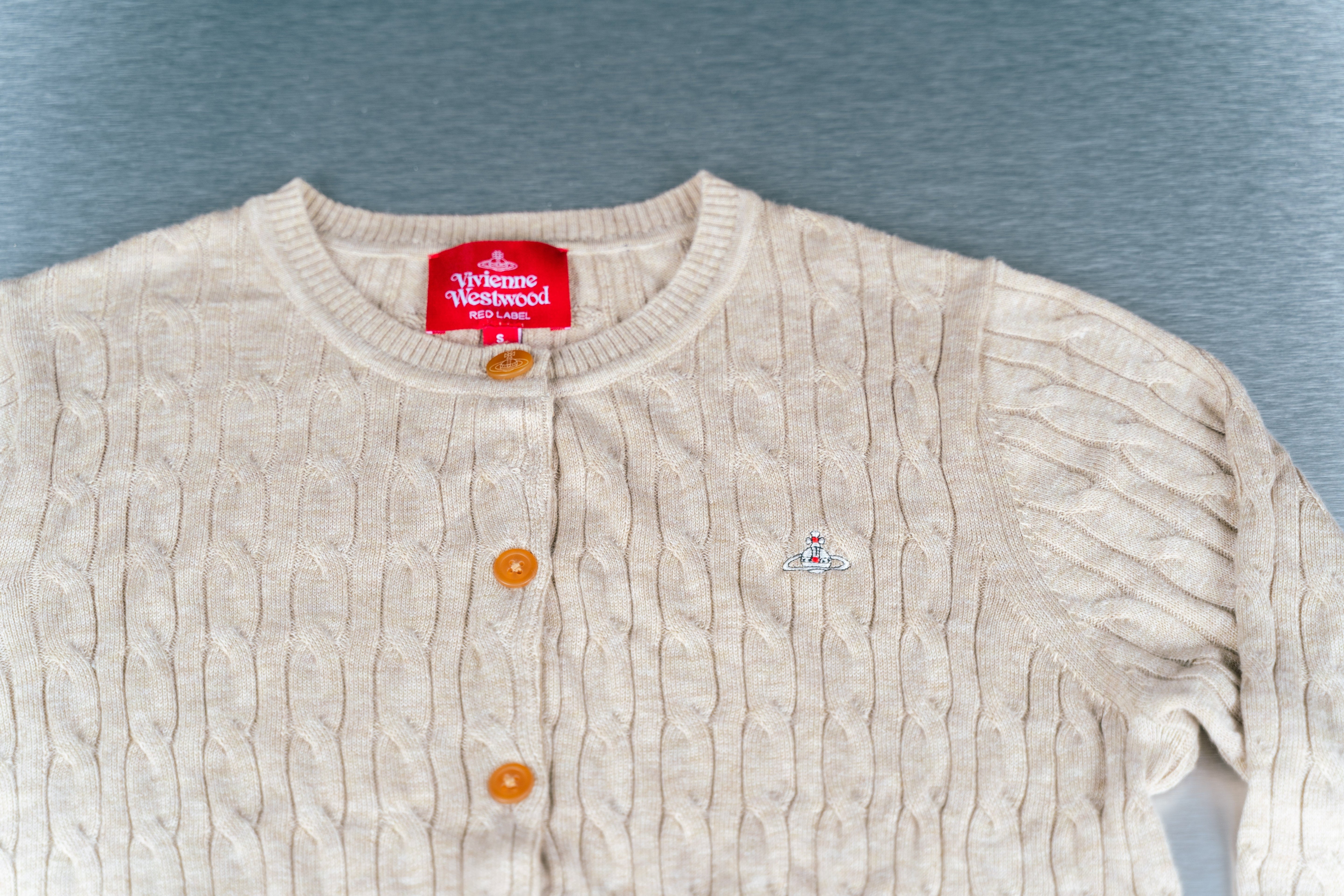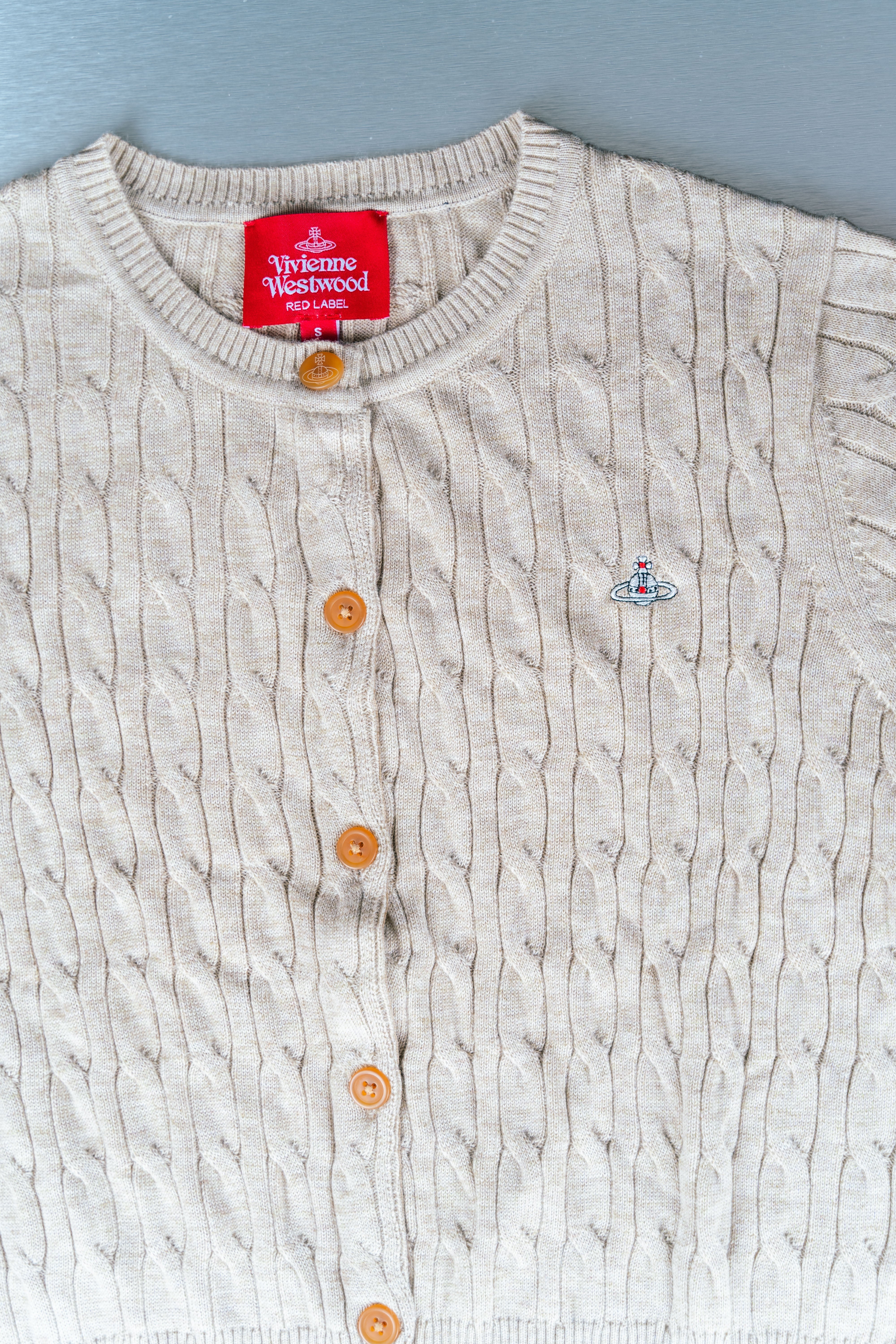 This Vivienne Westwood Light Beige Cable Knit Cardigan is a stylish and comfortable piece. This unisex cardigan is primarily beige in color, featuring a cable knit pattern throughout, including on the sleeves. It has a crew neck and a row of seven orange buttons down the center. A small embroidered logo is visible on the left side of the chest. The cardigan appears to be made from a type of wool or cotton blend. This cardigan is in Good condition and is a size S.