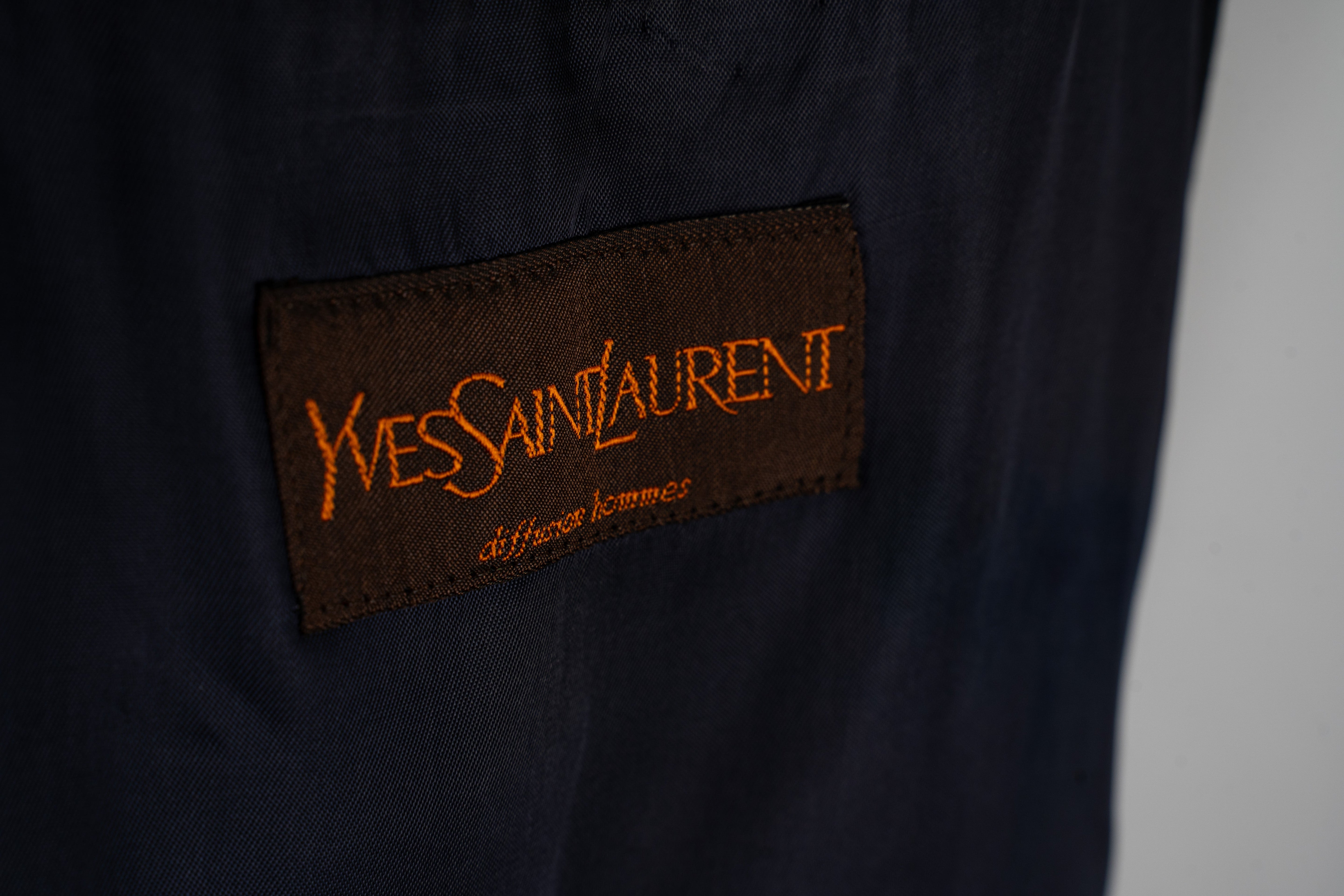 This Yves Saint Laurent Double-Breasted Blazer Jacket is a sophisticated outerwear piece. Crafted from a smooth fabric, likely wool or cotton-blend, this black blazer features a classic lapel collar and is fastened with four silver-toned buttons. It has two pockets on either side, positioned below the waistline. The sleeves are three-quarter length, ending just above the wrist. This sleek and sophisticated jacket is in Good condition.