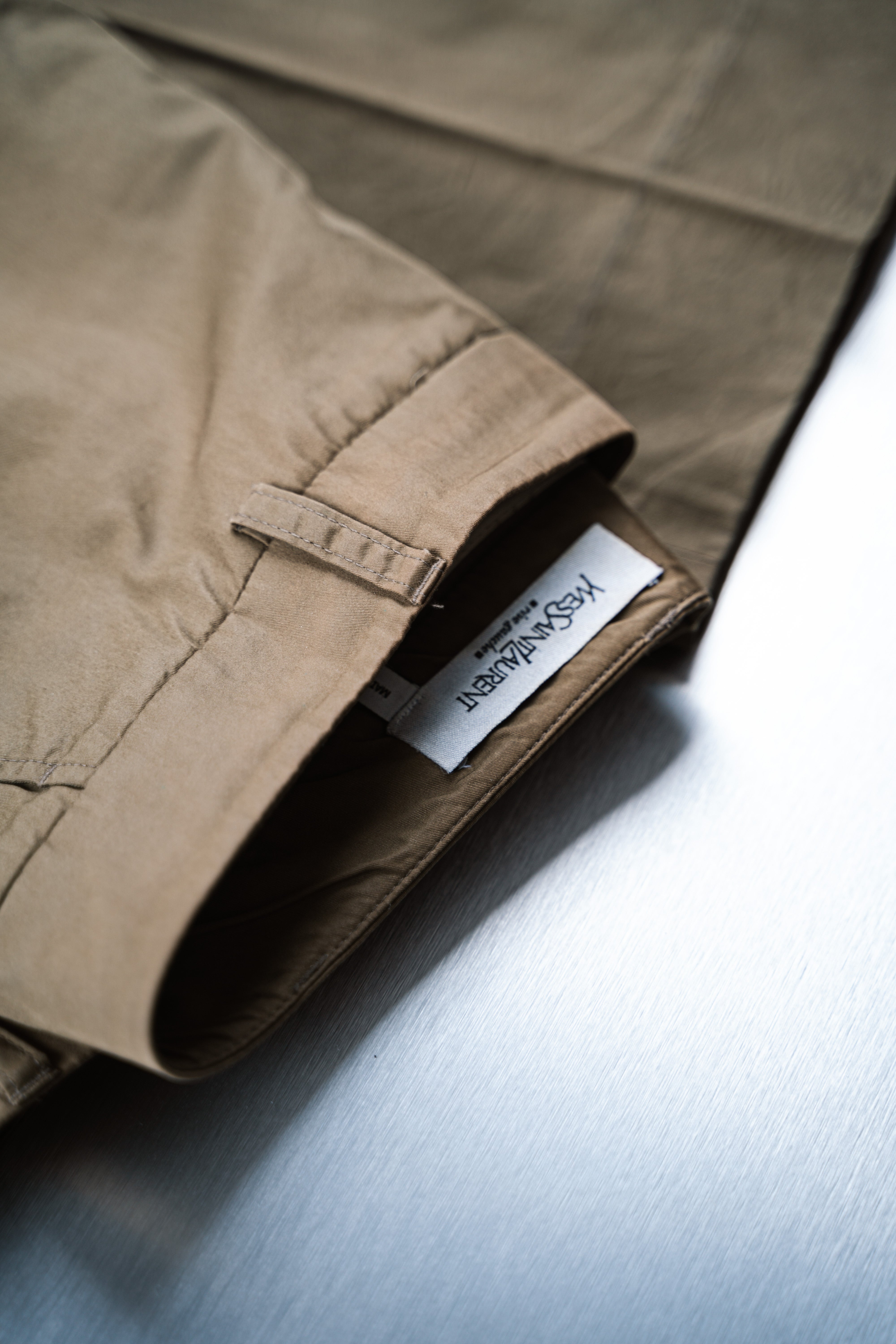 These Yves Saint Laurent Khaki Green Pants are a classic and sophisticated choice for men. Crafted from smooth khaki-colored cotton, these straight-leg trousers feature a flat front, belt loops, and two back pockets. A white label on the waistband displays the "YVES SAINT LAURENT" brand name. This product is in Good condition.