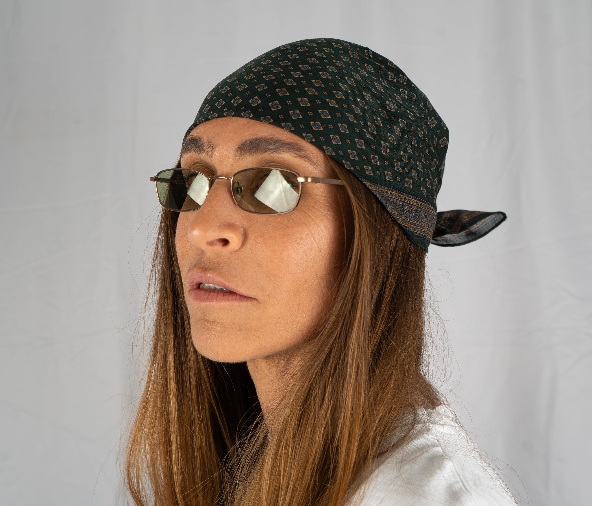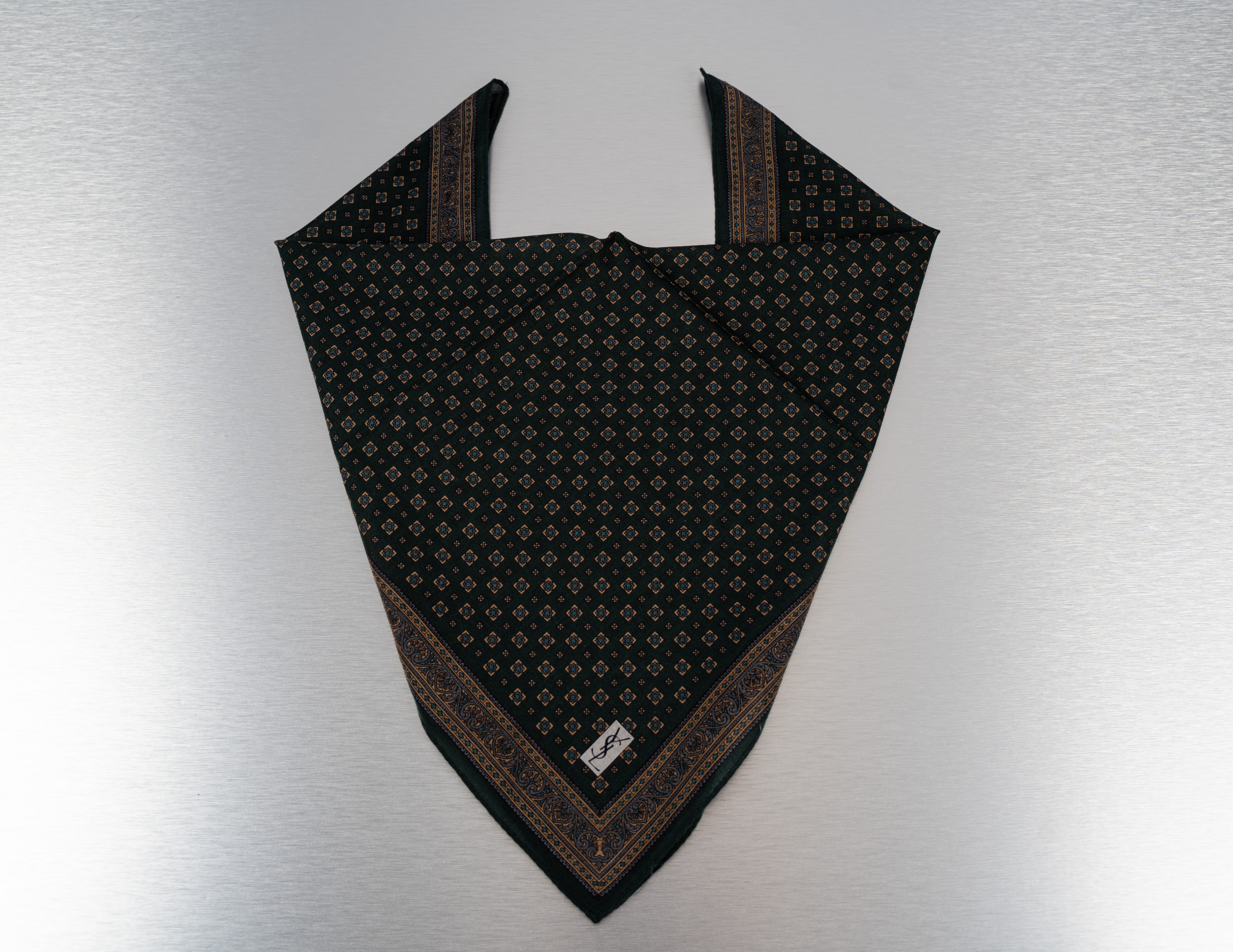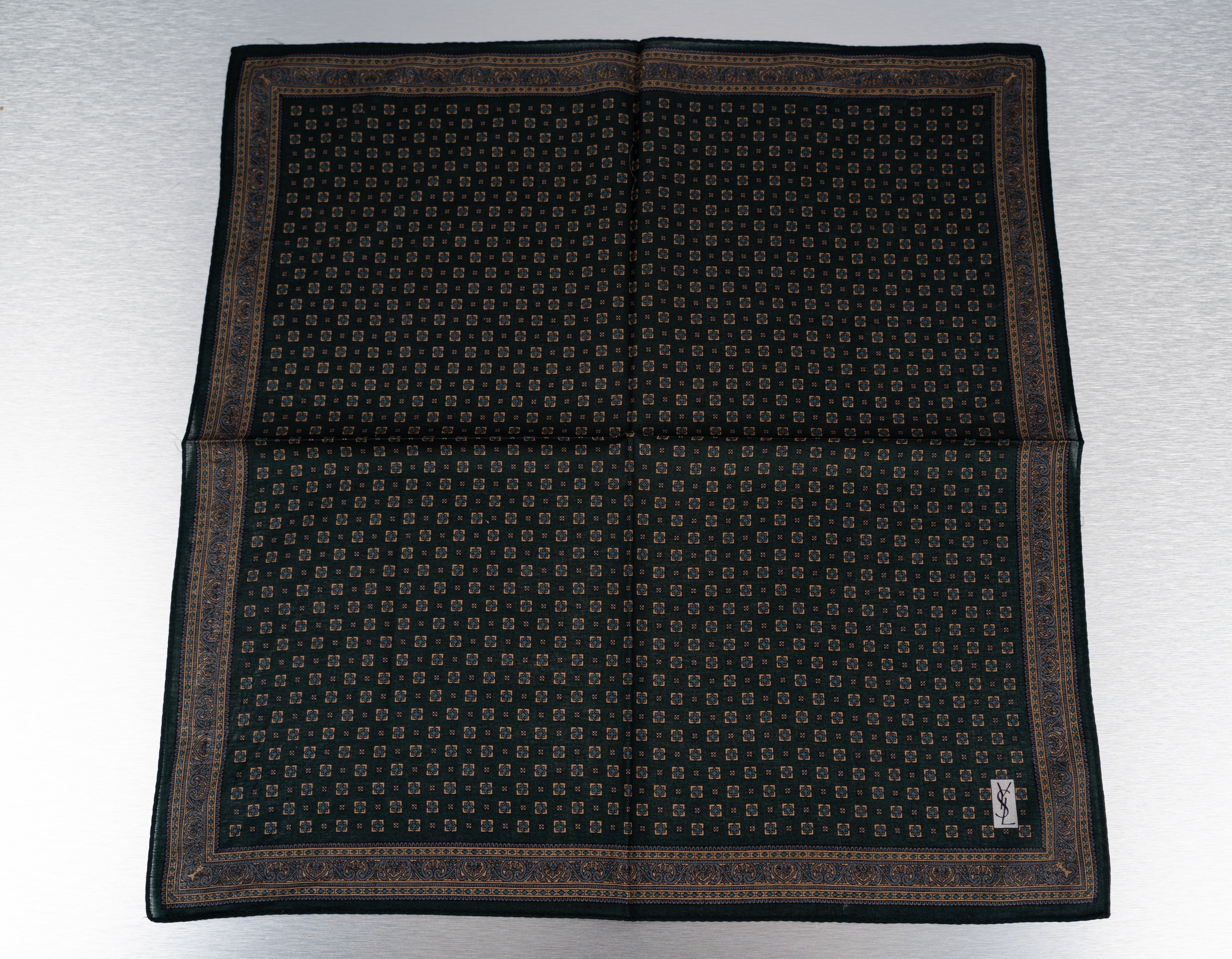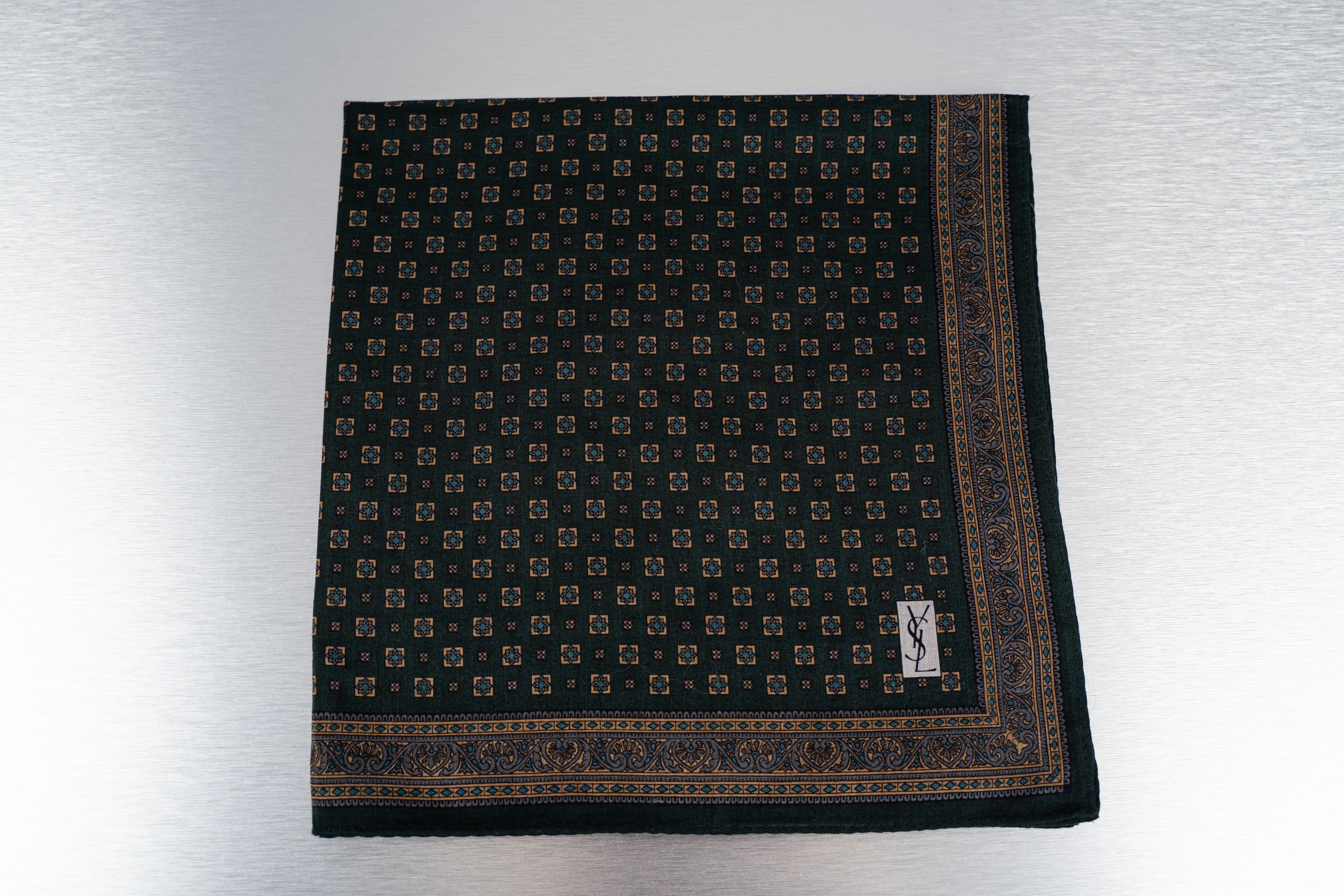 Yves Saint Laurent Bandana Scarf is a stylish accessory. This black bandana features a diamond pattern in shades of gold, blue, and red, with a brown border around the edges. The bandana is triangular in shape, with two straps at the top for tying around the neck. A small white tag with a black signature is located at the bottom center of the bandana. Made of silk, it is a stylish and comfortable accessory suitable for both men and women. This bandana is in Good condition.