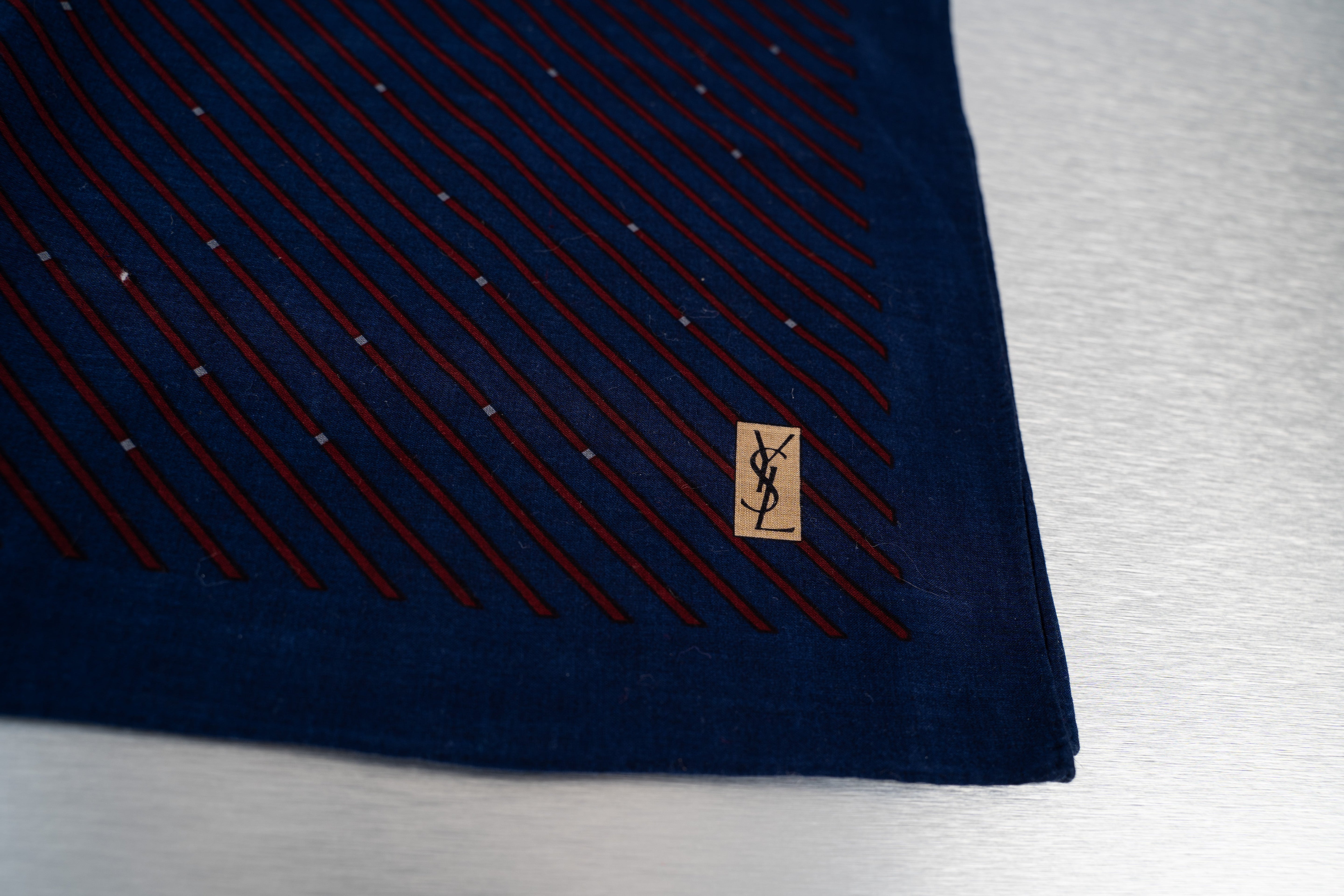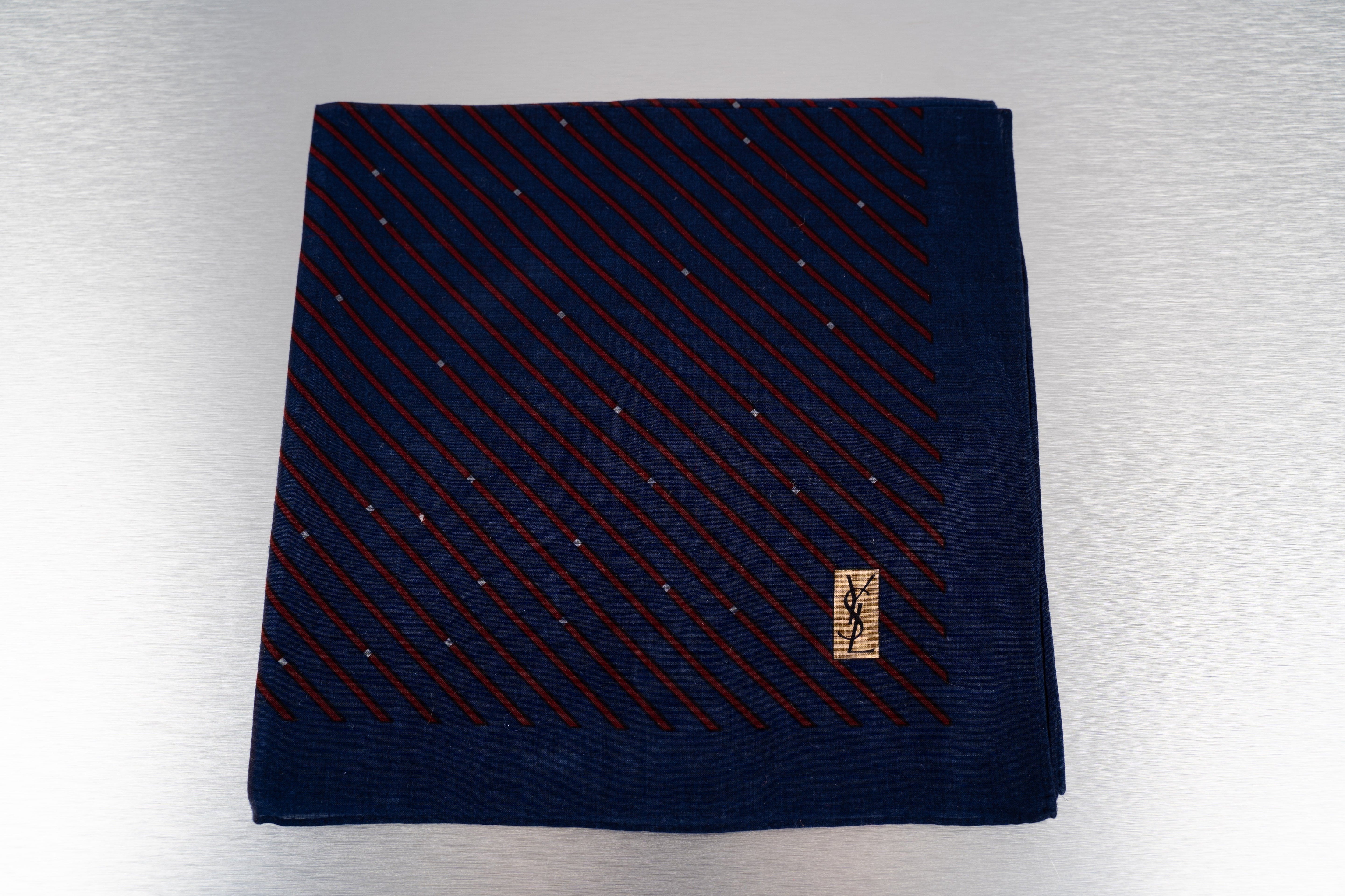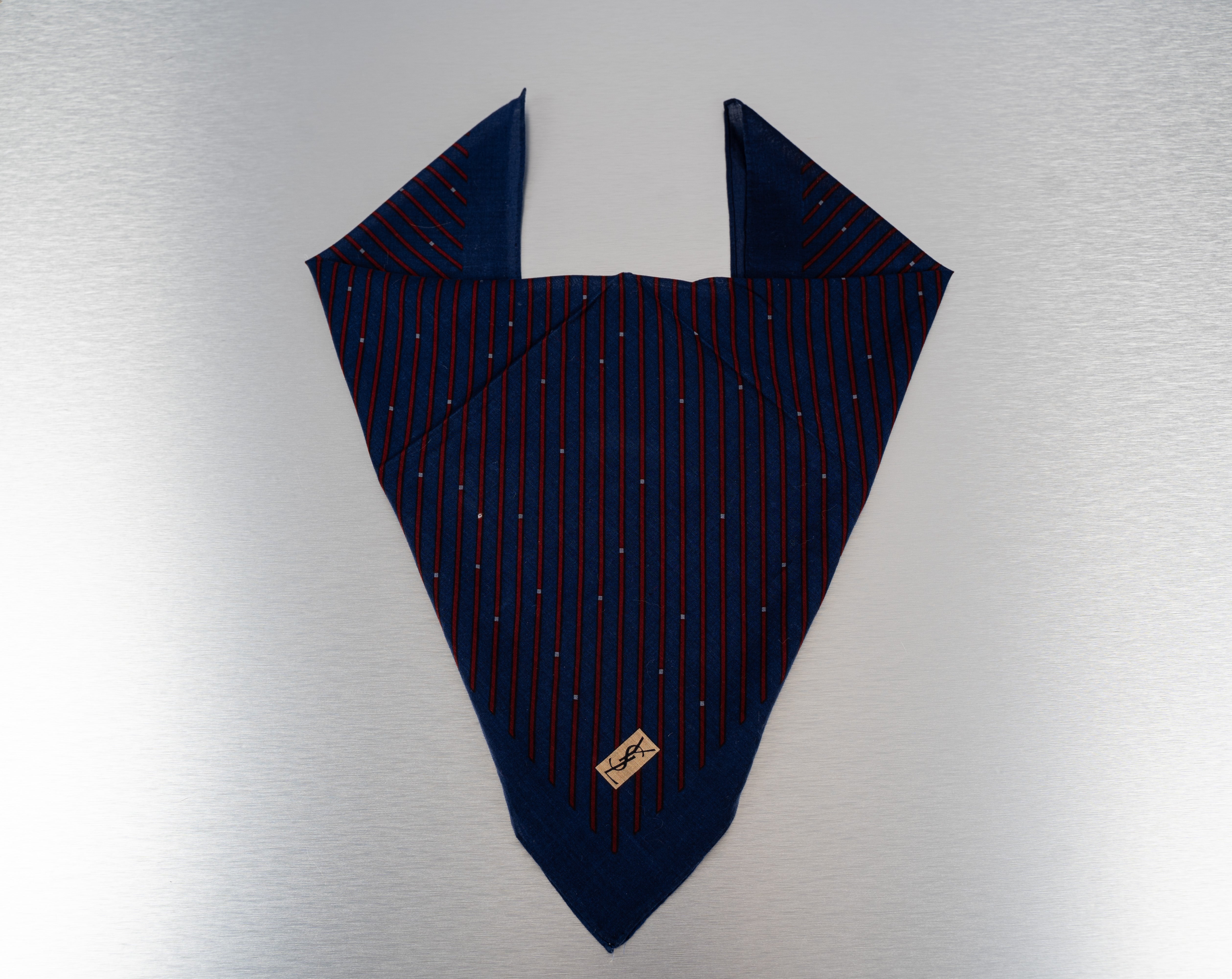 This Yves Saint Laurent Necktie is a stylish accessory for men. Crafted from a smooth, dark blue fabric, it features thin, red stripes and small, white dots. The edges are bordered in a solid navy blue that matches the dominant color of the tie, and a small, beige tag with a black, cursive signature is attached to the bottom center. This classic triangular tie is designed to be worn around the neck and appears to be made of silk. It is in Good condition.